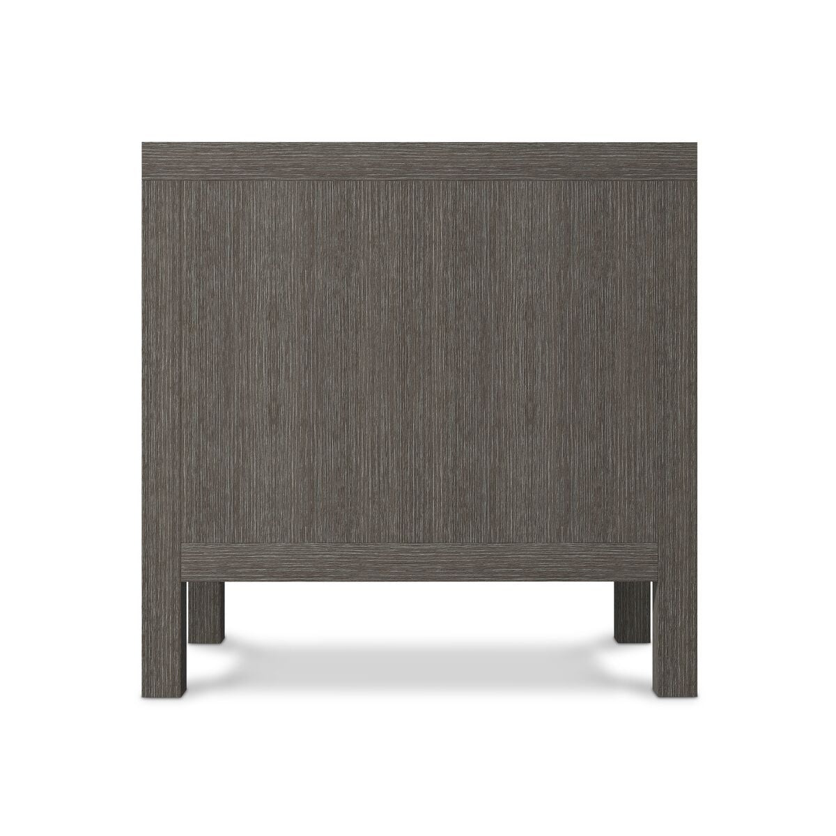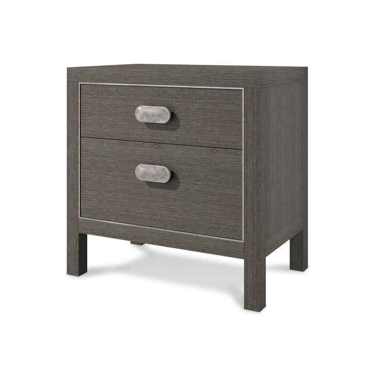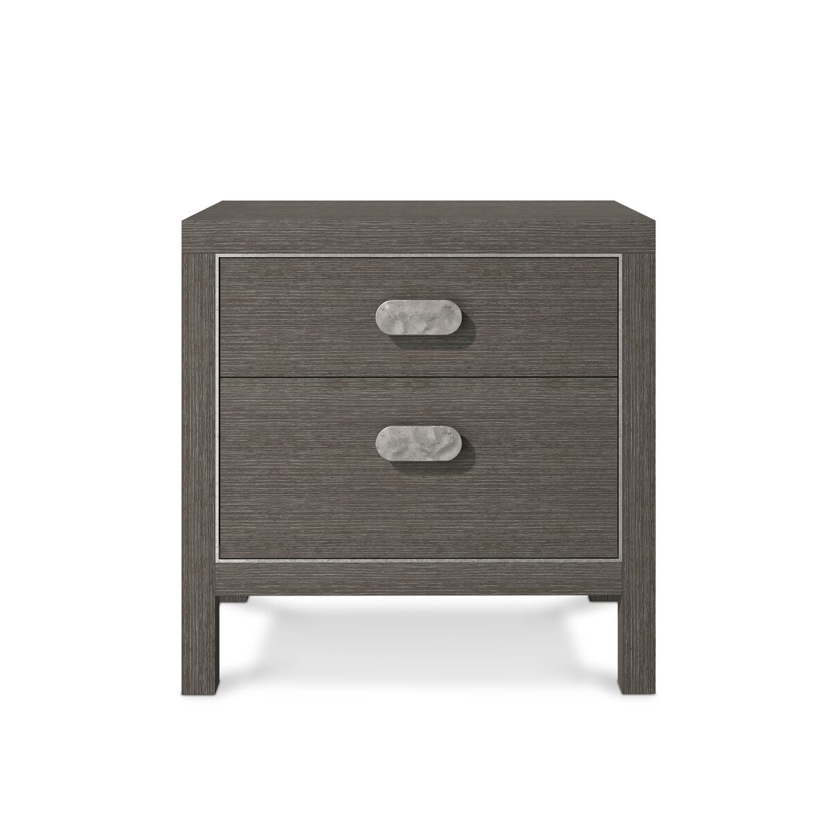 Nightstand In Porcini Finish With Inset Metal Frame In Bright Graphite Finish Around Two Soft-Close Drawers. Two-Port Usb Charging System On Back Of Case. Adjustable Glides.