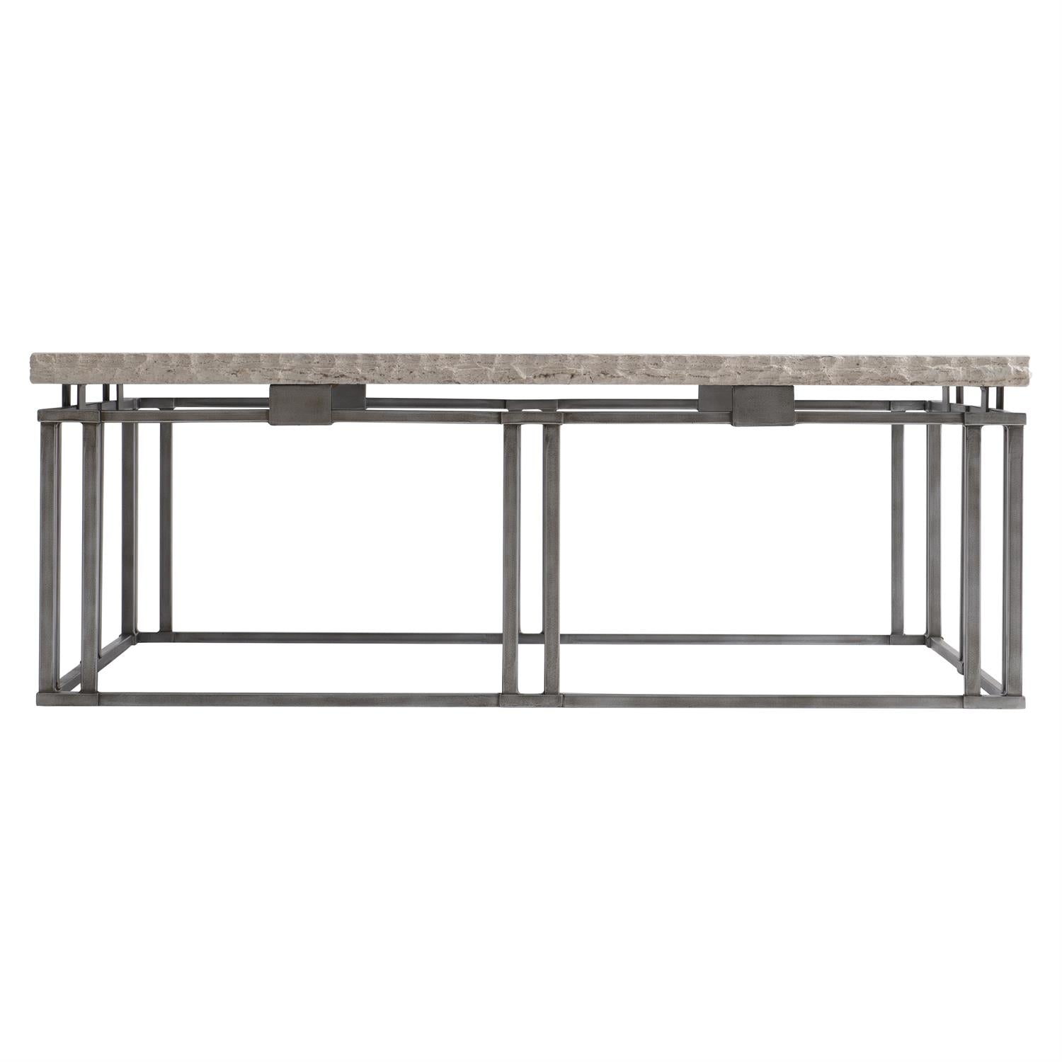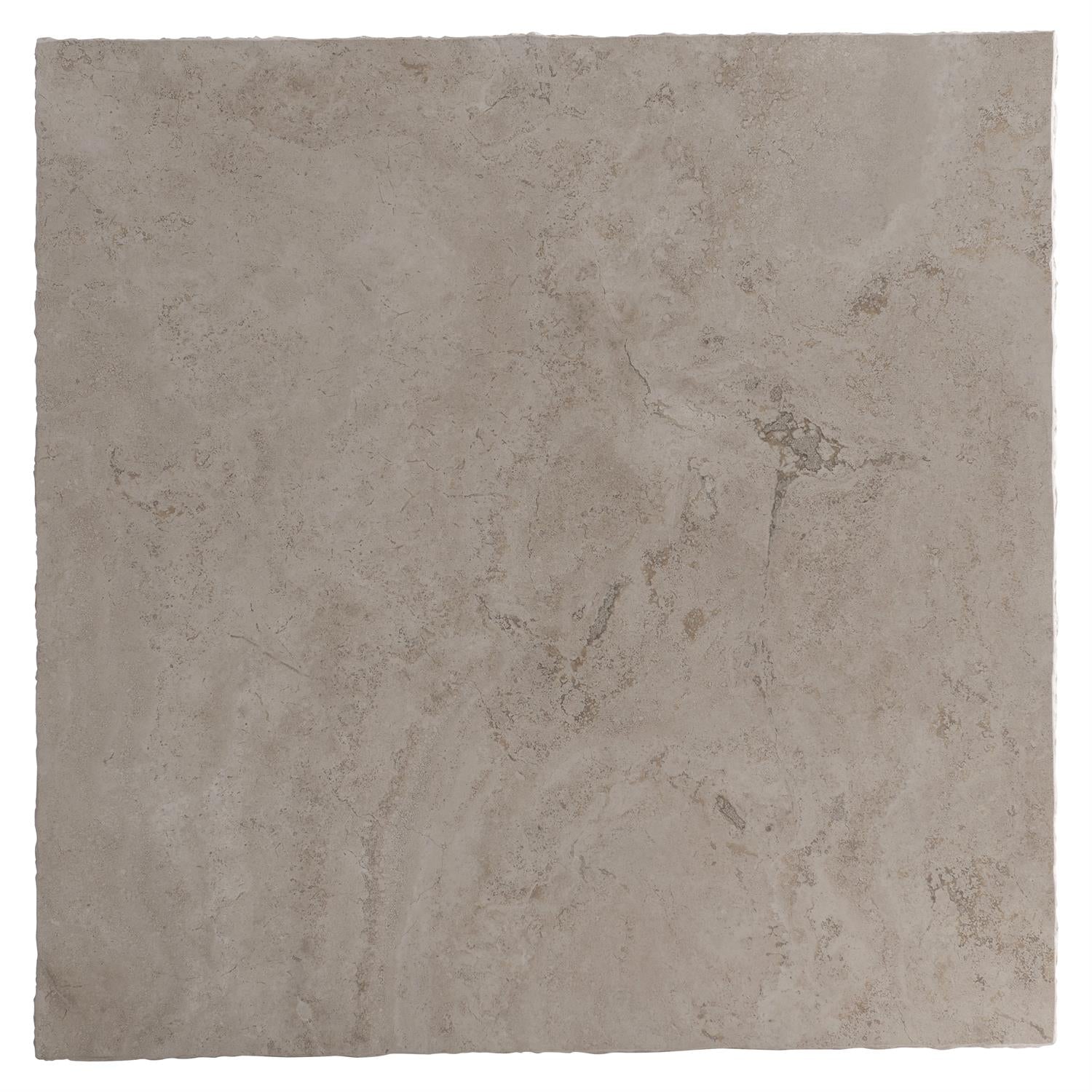 Honed Bianco Travertine Laminated Square Stone Top. Chiseled Edges. Metal Base In Silver Finish. Adjustable Glides.