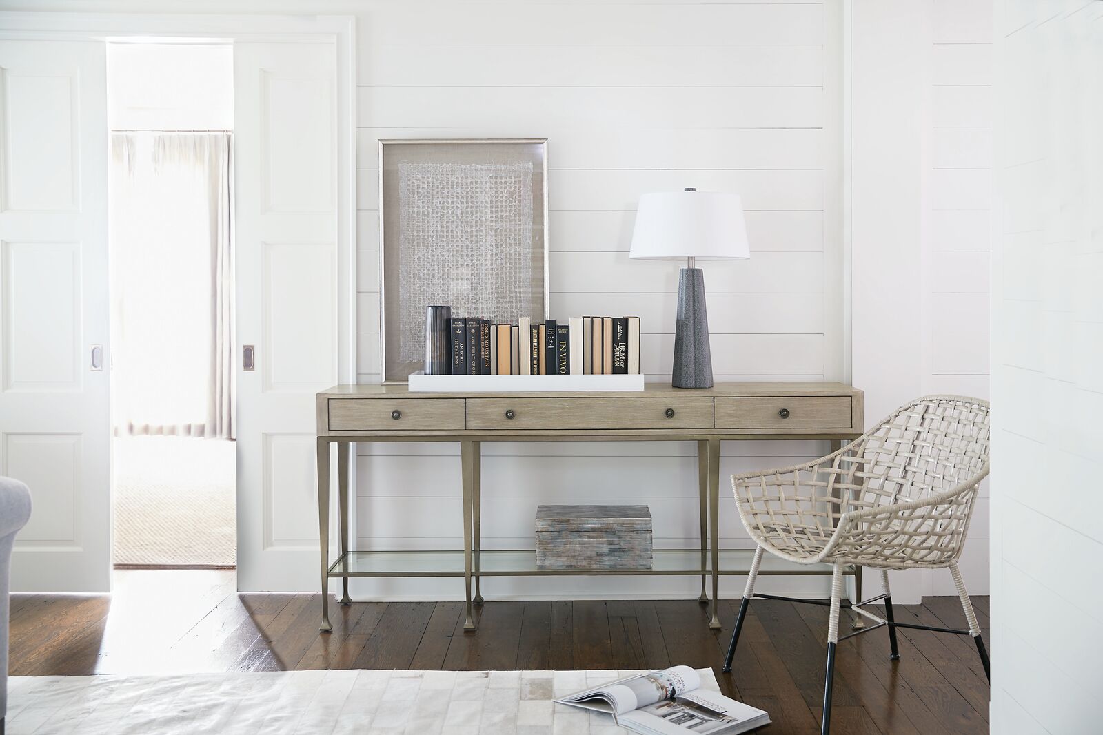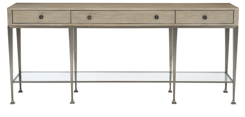 The Santa Barbara console table offers a fresh take on a traditional form. The simple, elegant design features a welded stainless steel base with eight slender, tapered legs with square feet. Oak veneers have been wire-brushed and cerused, which gives them subtle textures and lighter strokes of color in the grain. A Sandstone finish delivers a polished yet casual feel, while a Vintage Nickel finish on the steel base is tinted for an aged look. Three drawers and an inset tempered glass shelf allow for storage and display.
