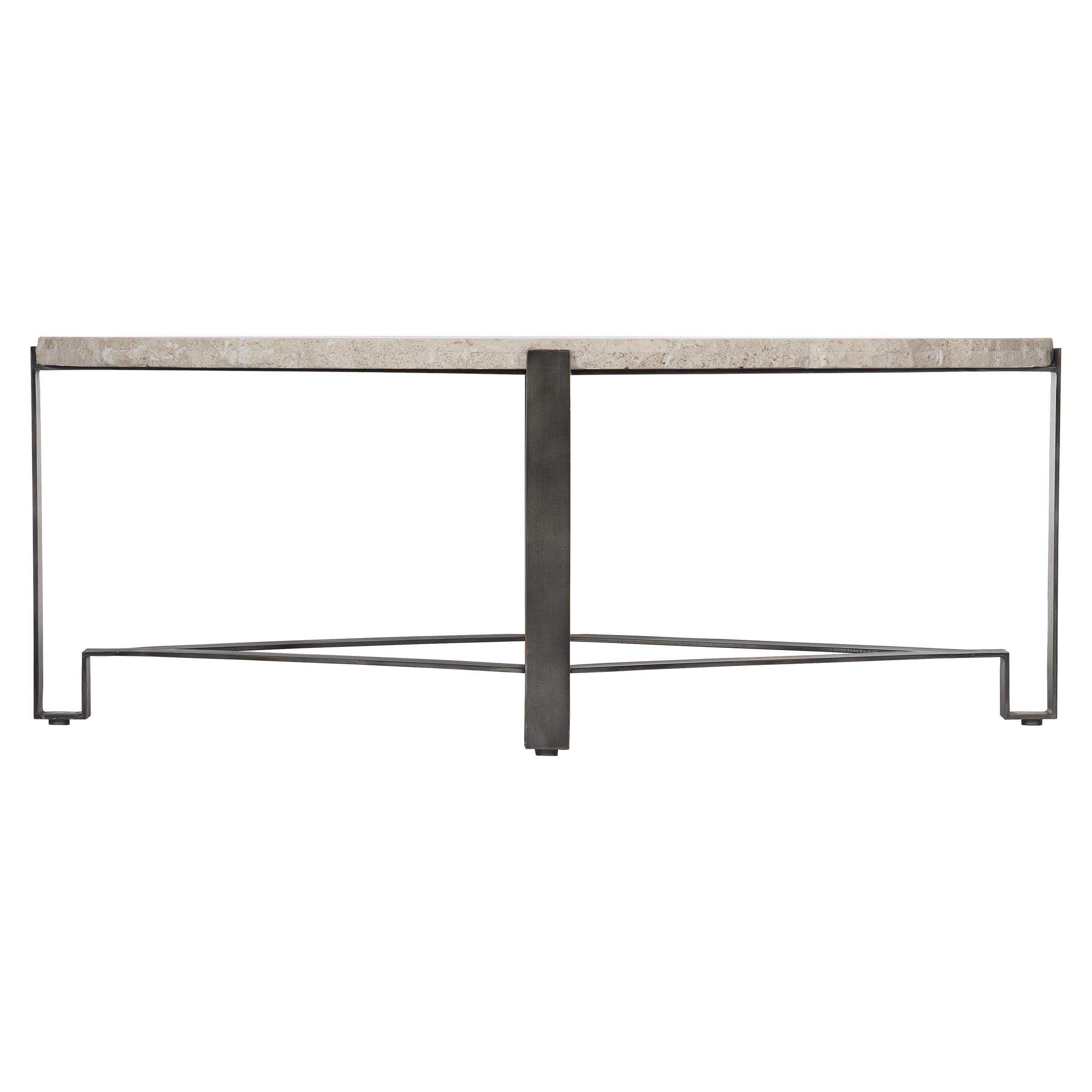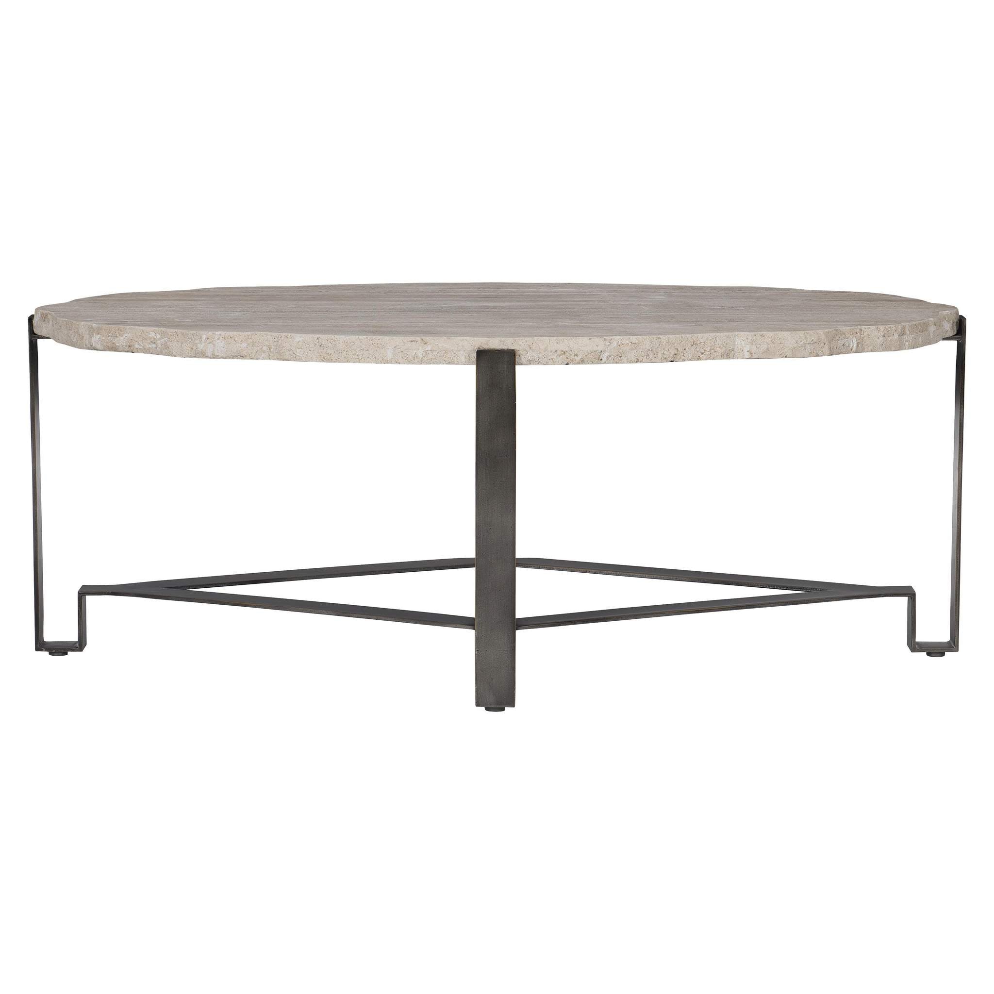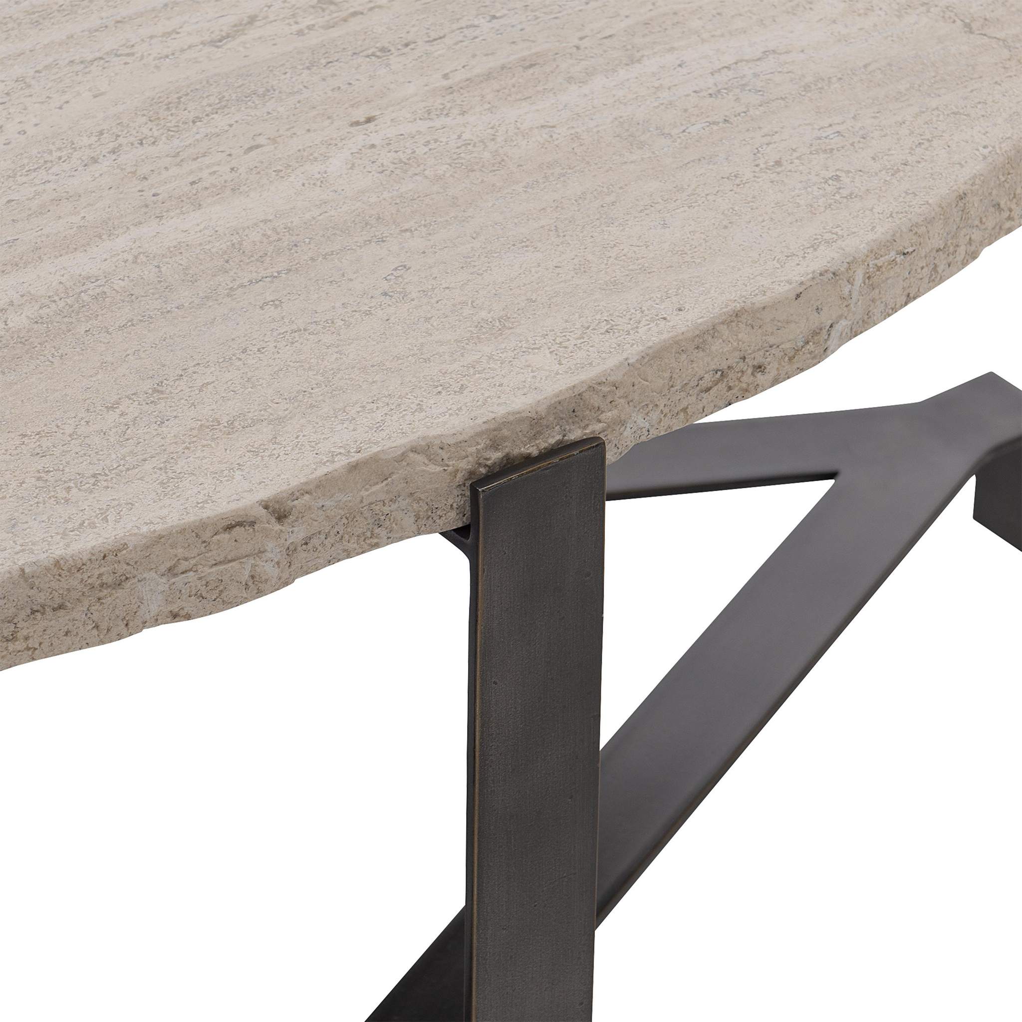 The Sayers cocktail table features an oval white travertine stone top with a chiseled edge. The smooth, cream-colored stone lends natural beauty and an elegant allure. An oil-rubbed bronze finish on the steel base creates an engaging contrast, while crisp lines and geometric shapes create a sense of order.