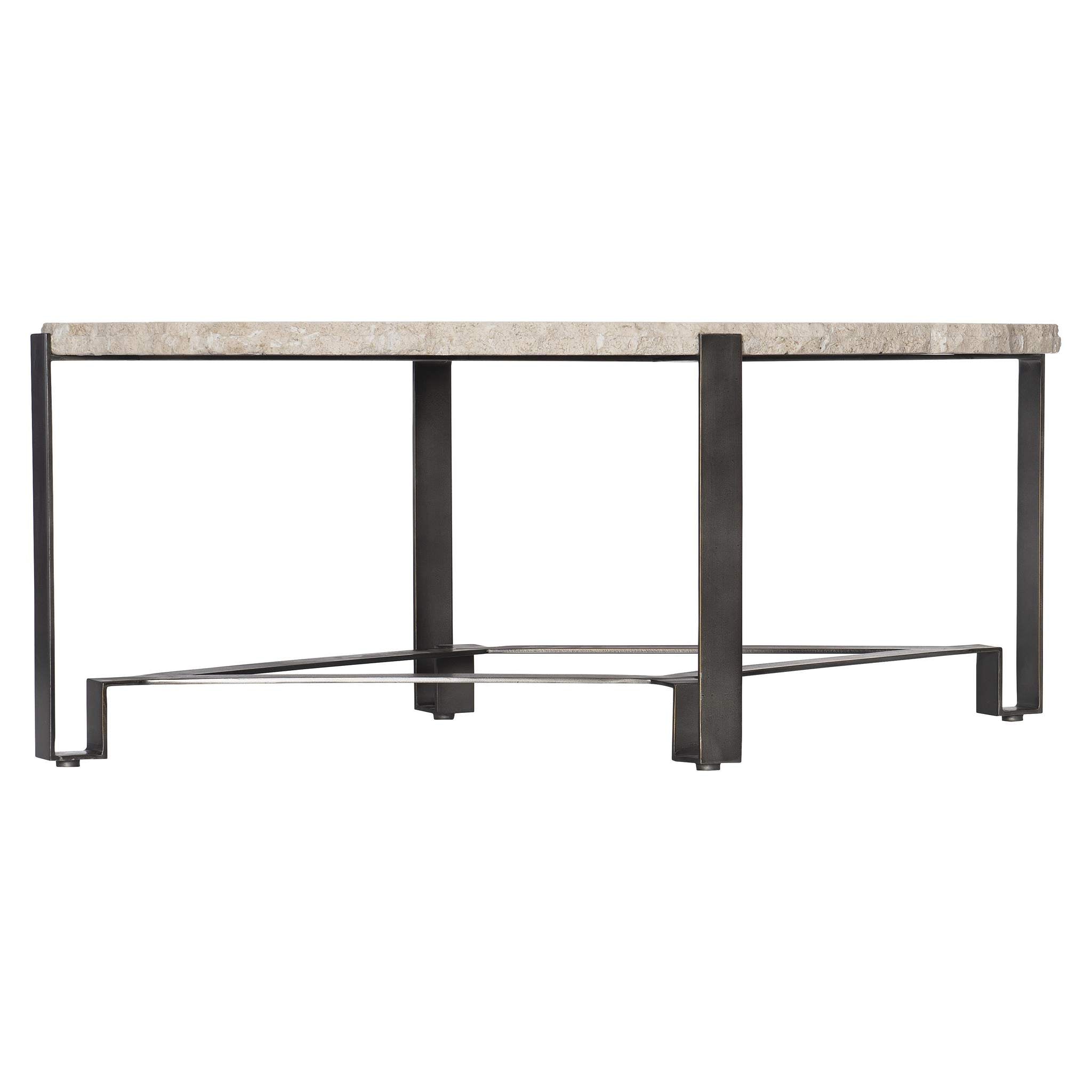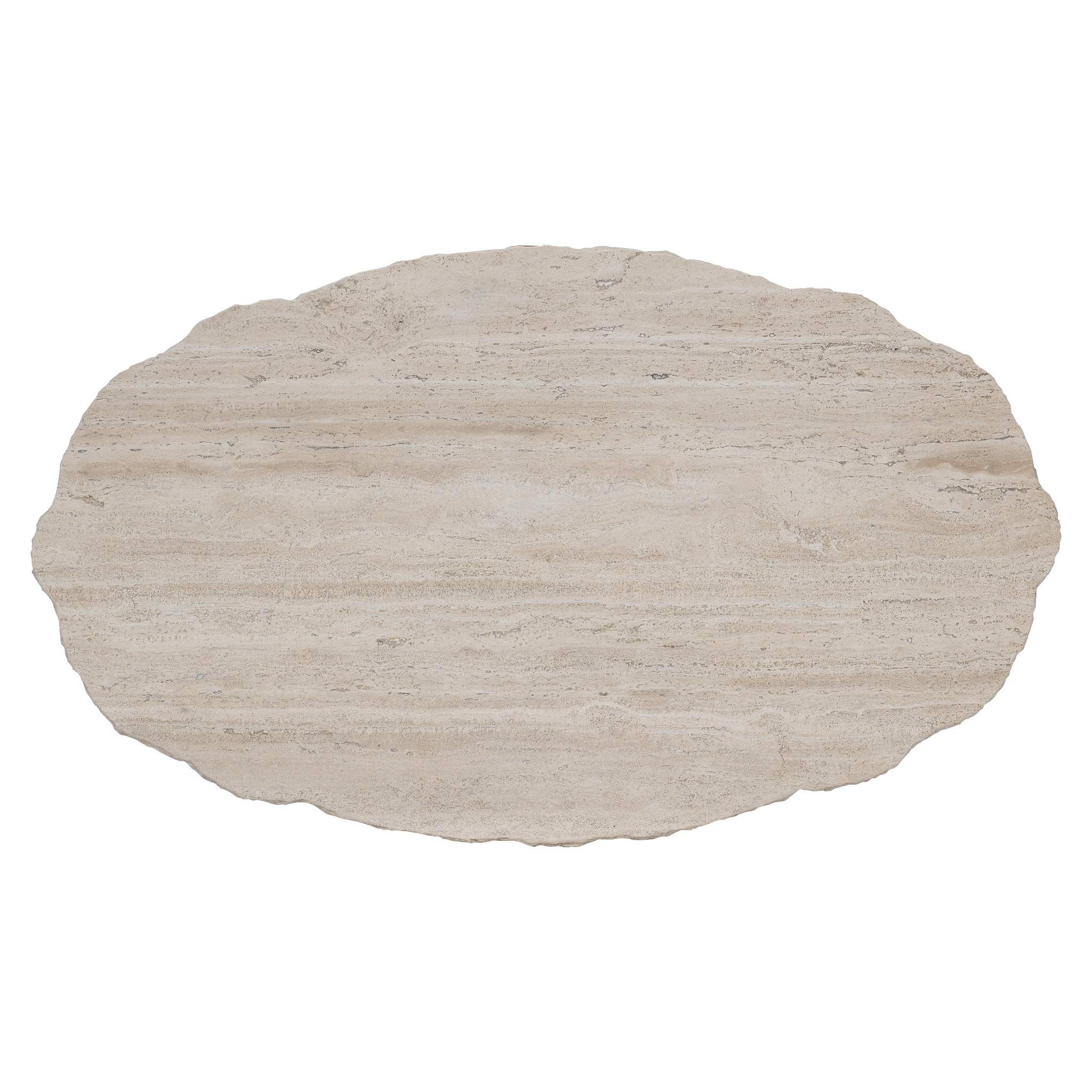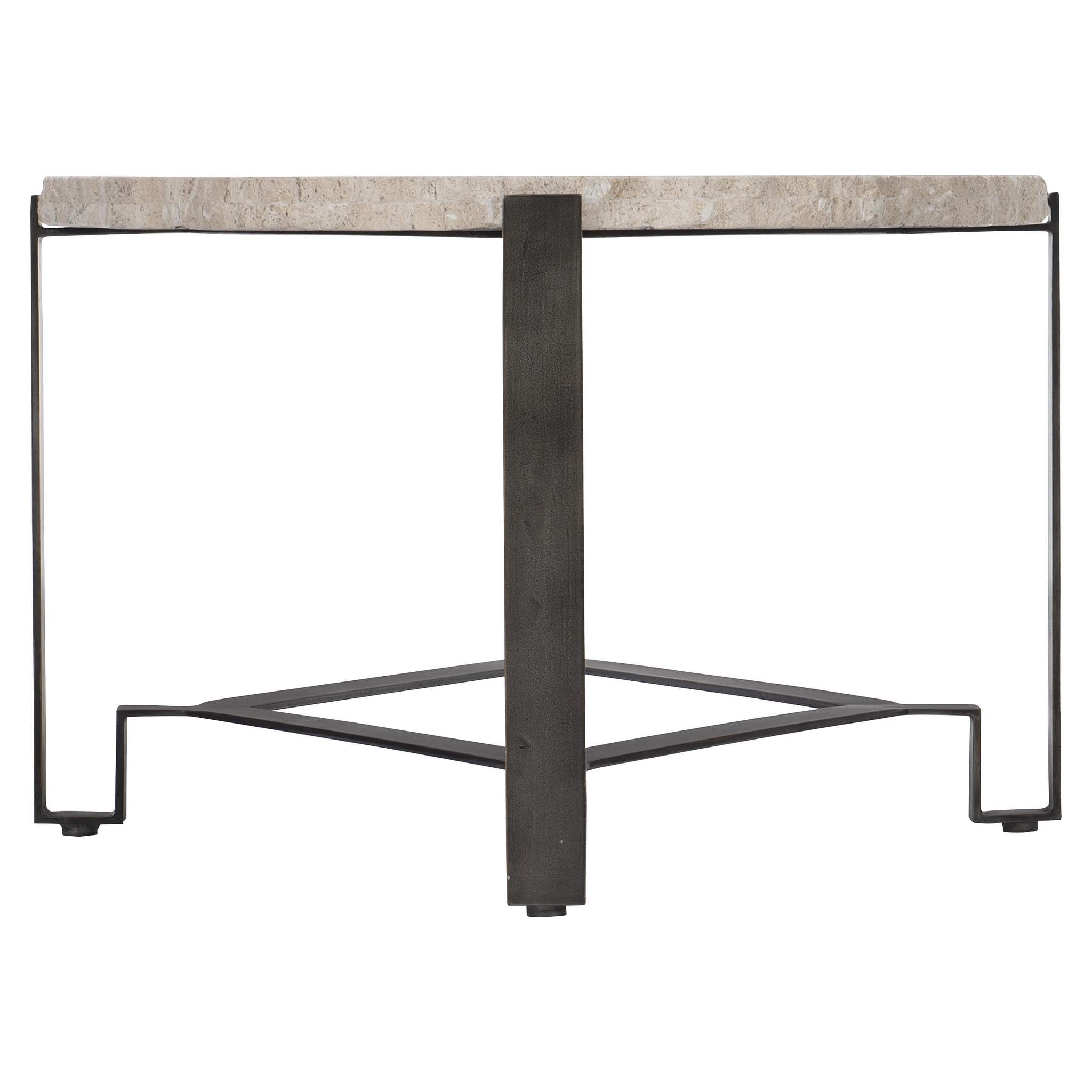 The Sayers cocktail table features an oval white travertine stone top with a chiseled edge. The smooth, cream-colored stone lends natural beauty and an elegant allure. An oil-rubbed bronze finish on the steel base creates an engaging contrast, while crisp lines and geometric shapes create a sense of order.