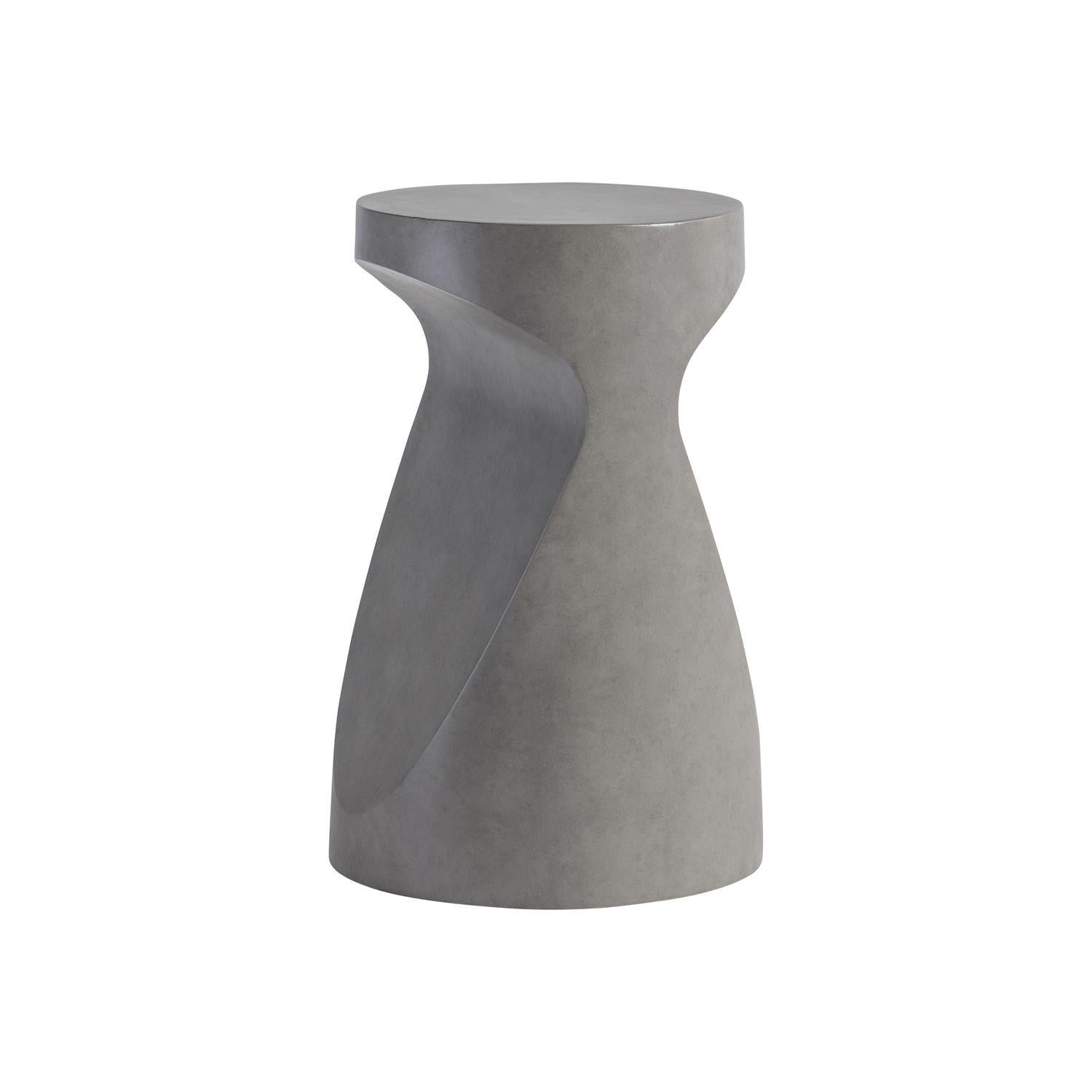 Hourglass shaped base cast resin table in textured faux stone dark grey finish. oval shaped opening in base. round. adjustable glides.