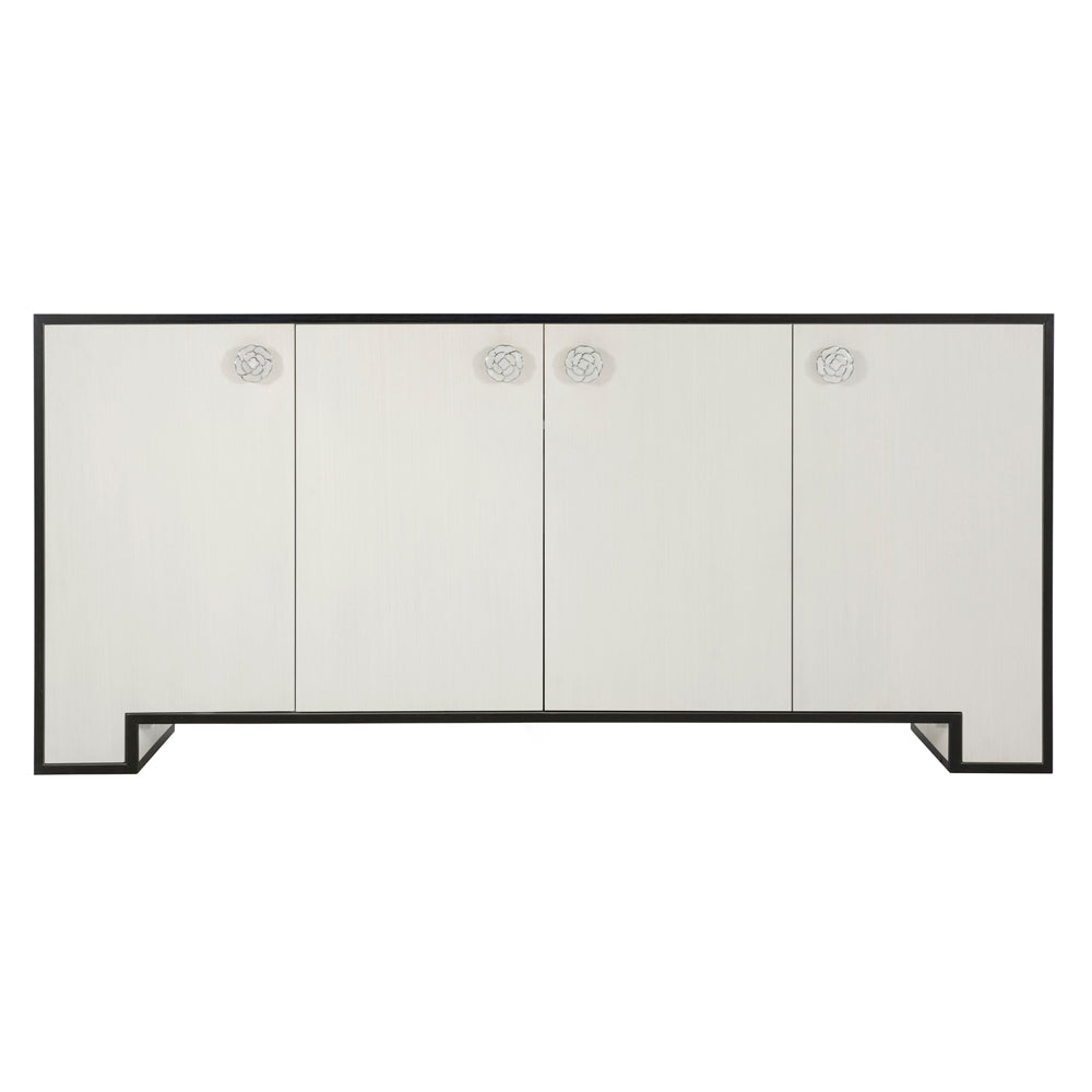 This crisply tailored door chest is distinguished by a sleek Eggshell veneer framed by starkly contrasting dark Onyx and camellia-inspired pulls. Silhouette is defined by bold contrasts, crisp tailoring and a hint of Hollywood Regency glamour. The Silhouette buffet has an elegant, luxurious feel. Its striking geometric design is highlighted by a frame in dark Onyx that starkly contrasts with its sleek Eggshell veneer. Inspired by camellias, ornamental pulls in brushed stainless steel add a soft, feminine accent.