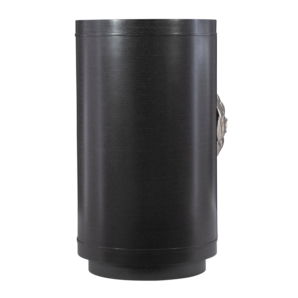 A true standout, this buffet sets a gleaming flower-shaped pull against a background of textured wood in a dark Onyx finish. Silhouette is defined by bold contrasts, elegant detailing and a hint of Hollywood Regency glamour. The Silhouette buffet is a study in pattern, texture and subtle curves. Crafted from anigre wood in a dark Onyx finish, its silhouette artfully combines classic style with effortless sophistication. Singular in its design, an oversized camellia-shaped pull in brushed stainless steel makes this piece a standout.