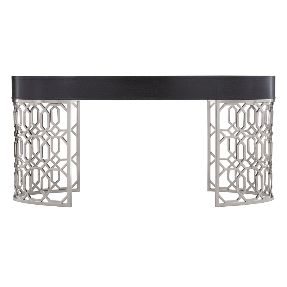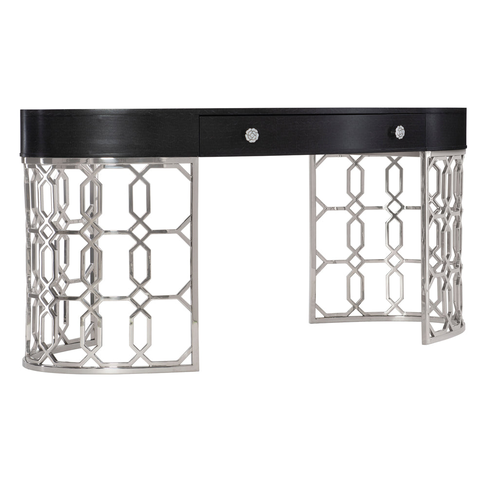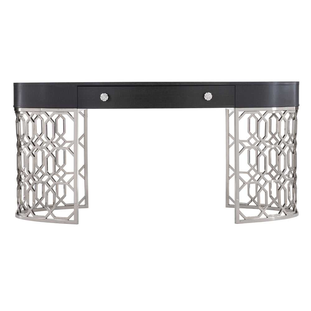 Inspired by Hollywood Regency design, this opulent desk features a dark oval top resting on brilliant stainless steel columns. Silhouette is defined by bold contrasts, subtle curves and a hint of Hollywood Regency allure. The glamorous Silhouette desk exudes opulence with dazzling materials and feminine accents. A Figured Onyx finish on the fancy face oval top offers an intriguing texture. The single drawer features elegant floral pulls with inlaid kabebe shells. Crafted from polished stainless steel, two semi-circular columns feature a striking geometric pattern.