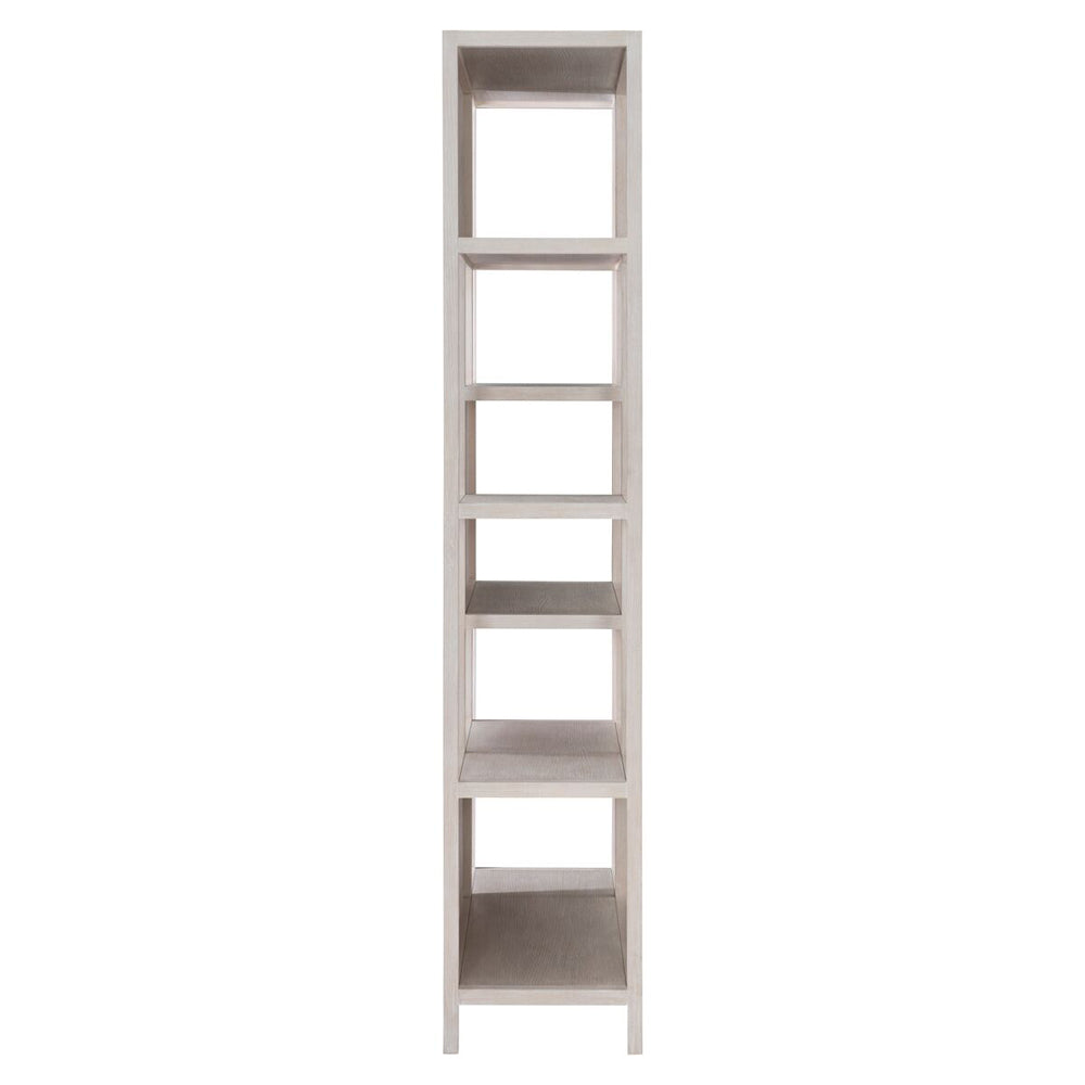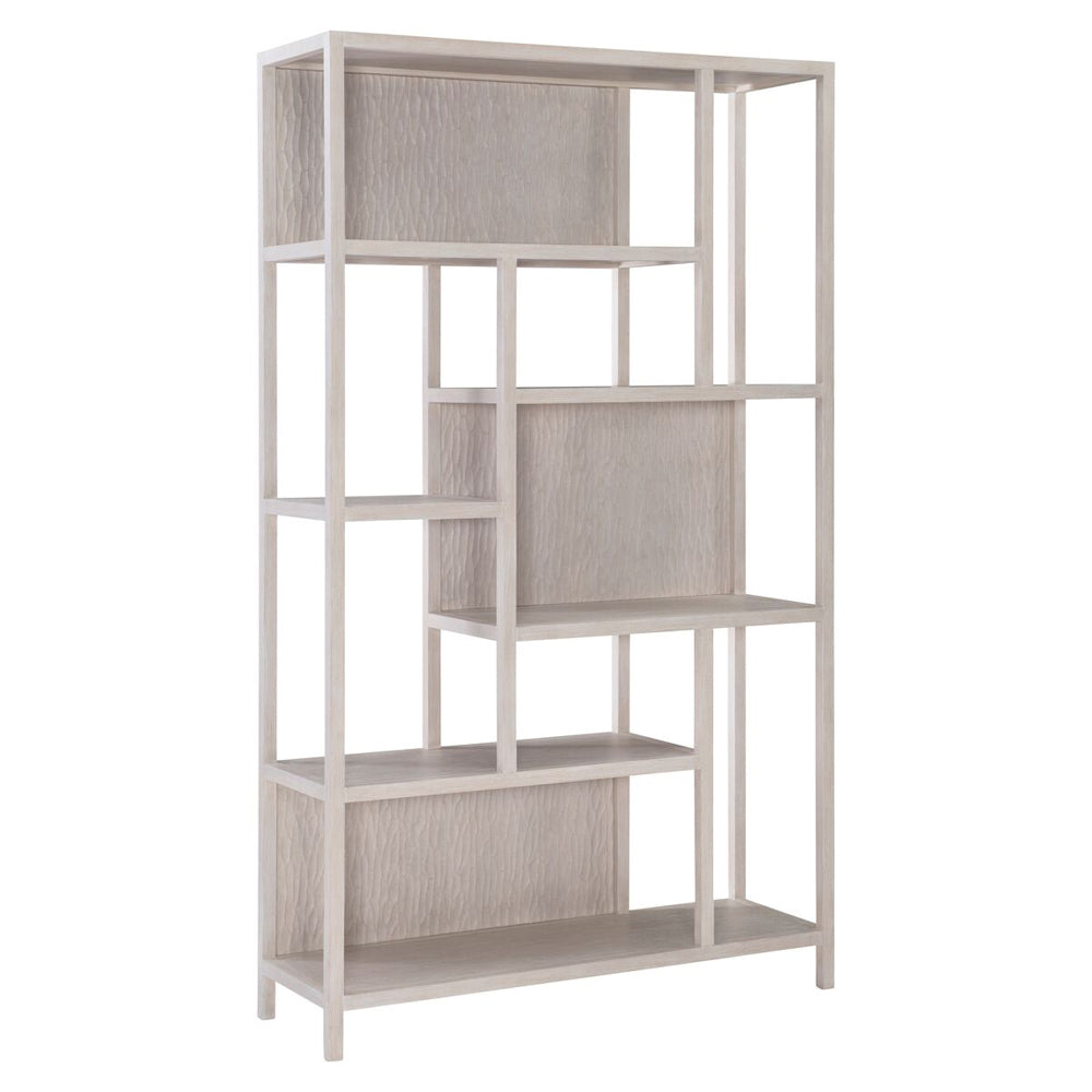 This etagere creates storage from geometric shapes and figurative panels. An artistic nod to Mondrian is found in the geometric lines of the Solaria etagere. The wood frame showcases quartered white oak veneers in a Weathered Bone finish. The back is open, except for staggered cast resin panels in a chiseled pattern design. The result is an incredibly functional work of art.