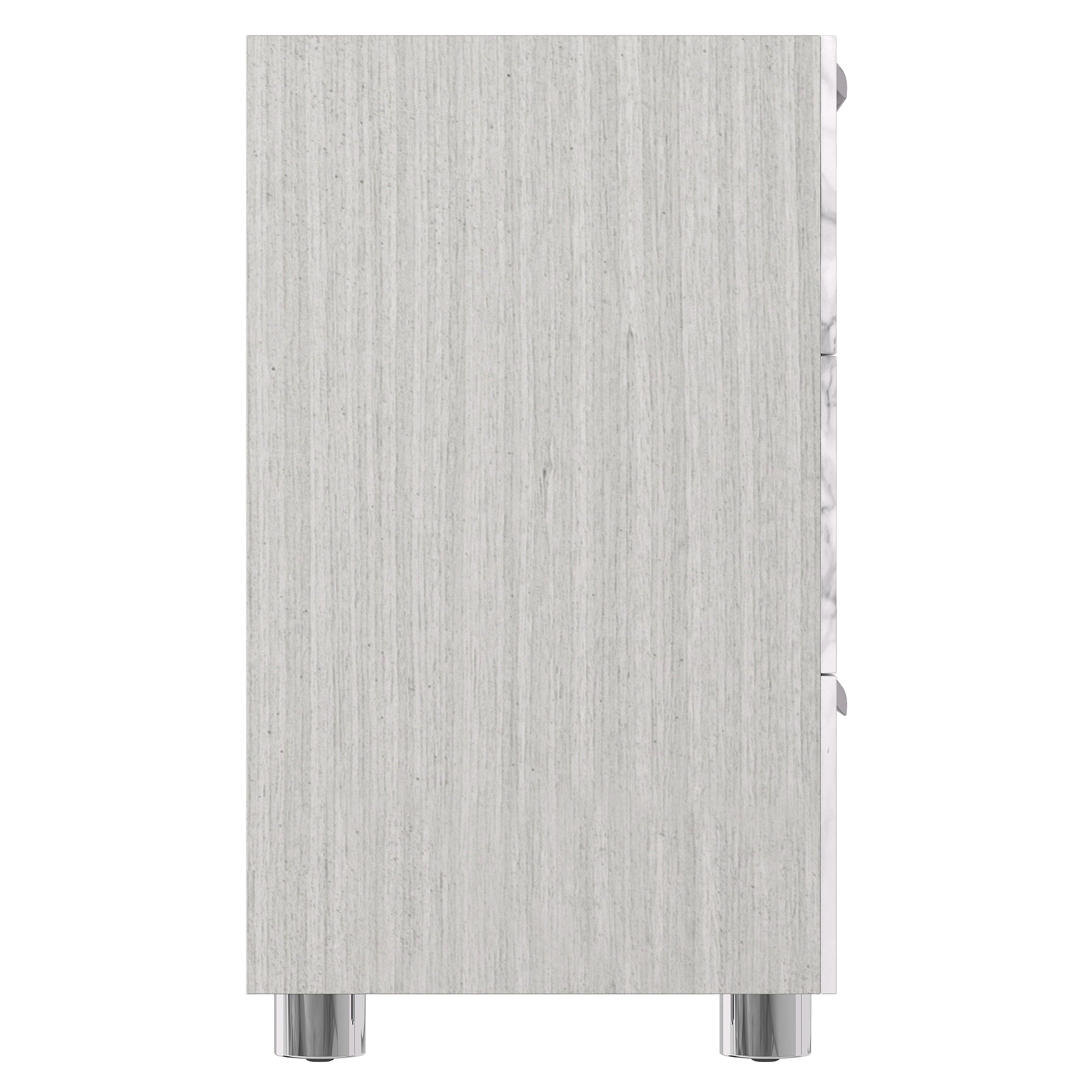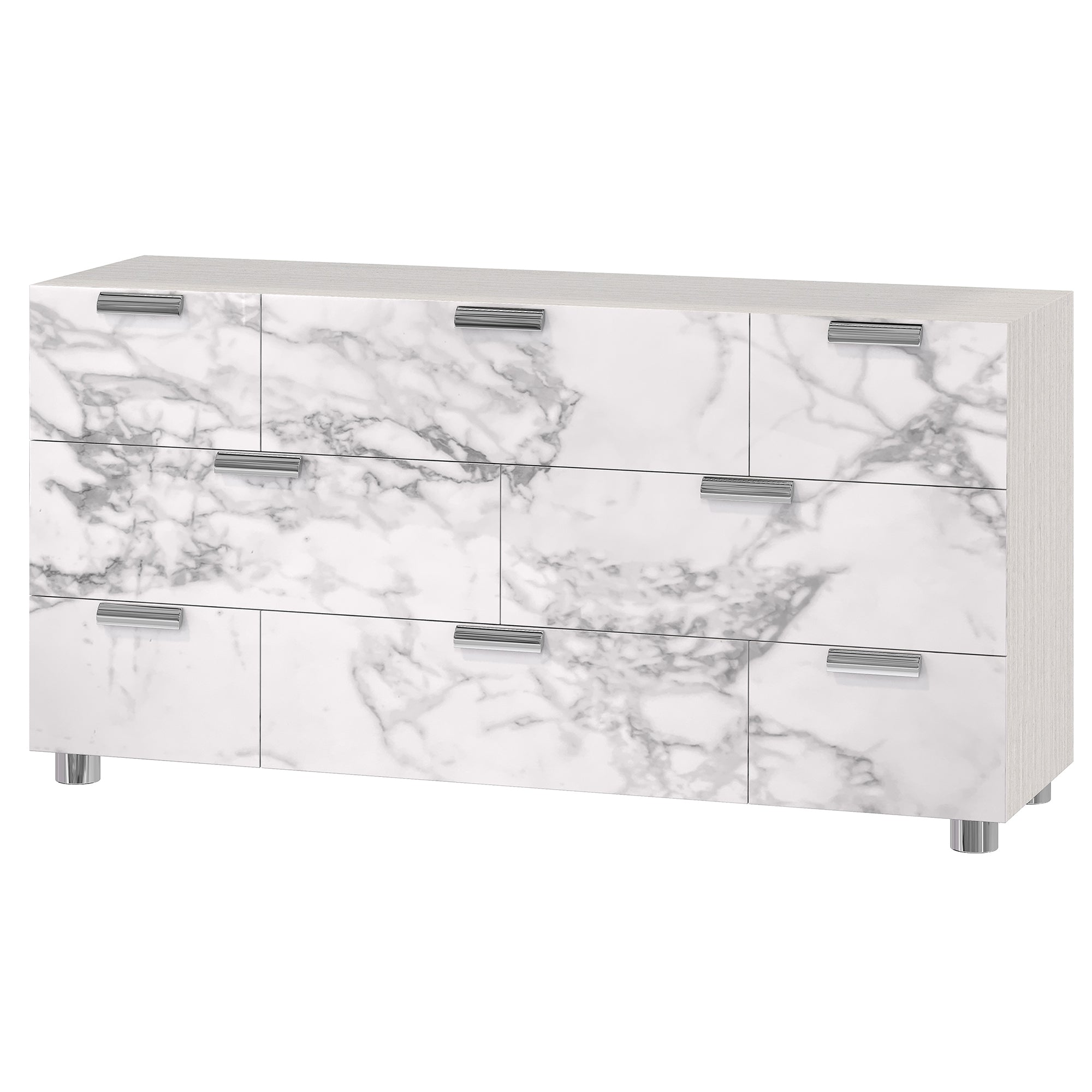 Mist finished case with eight drawers with stone fronts. Polished Nickel feet with adjustable glides.