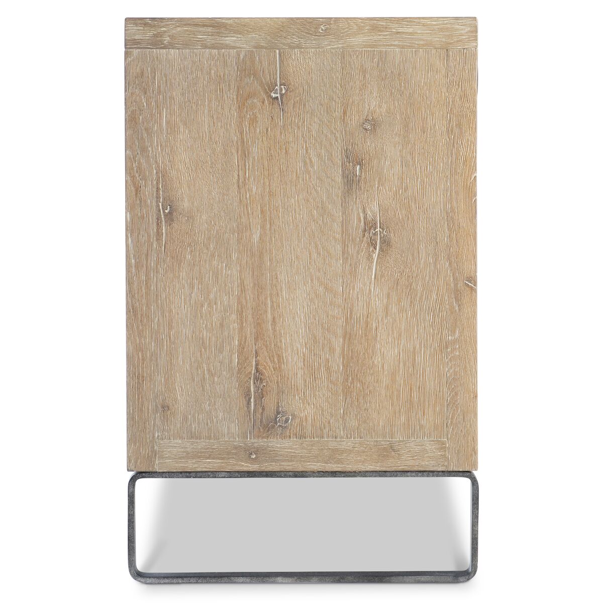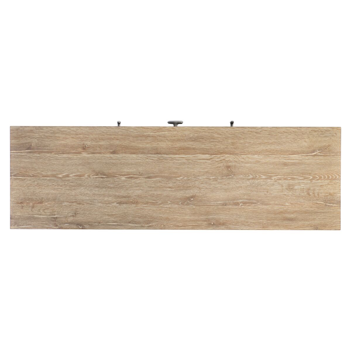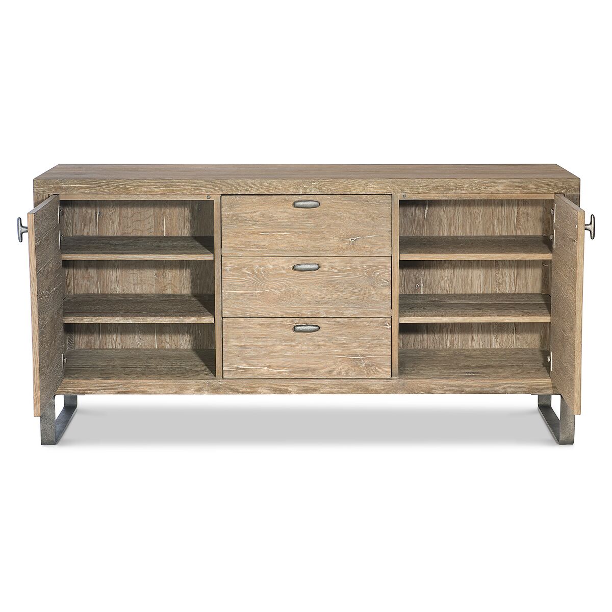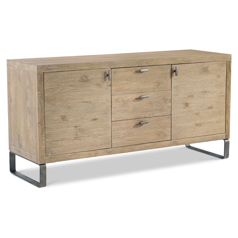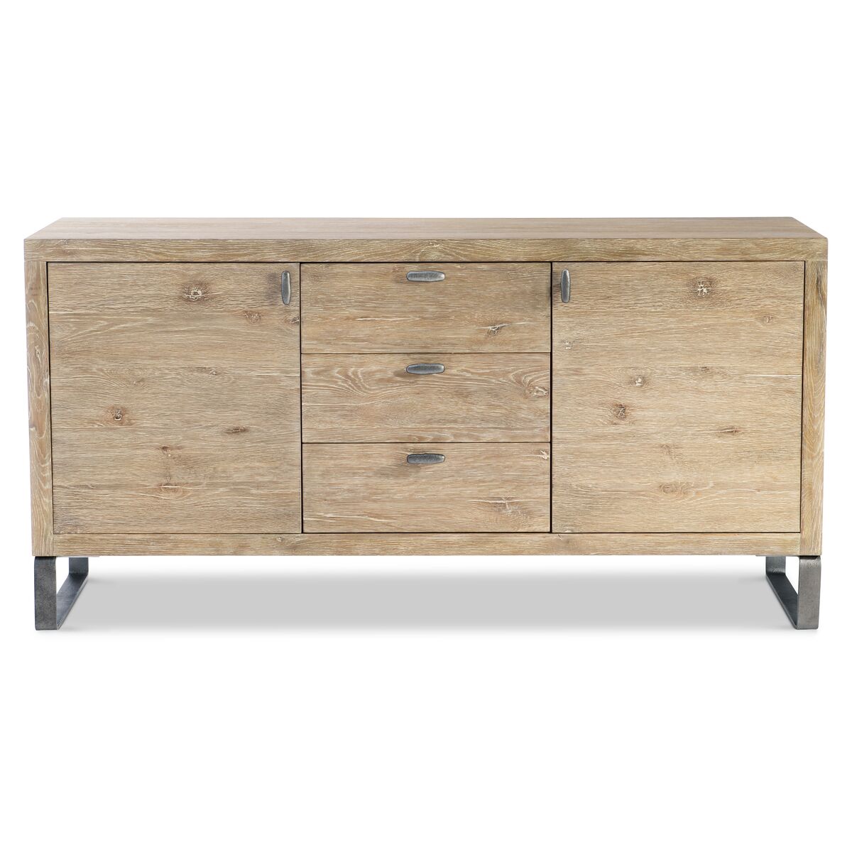 Wirebrushed Oak Buffet In Aurum Finish With Two Pull-To-Open, Soft-Close Doors. Three Pull-To-Open, Soft-Close Drawers With One Silver Insert And Two Wrapped Pads. Adjustable Shelves. Applied Texture Steel Sled Base In Barlow Finish. Adjustable Glides.