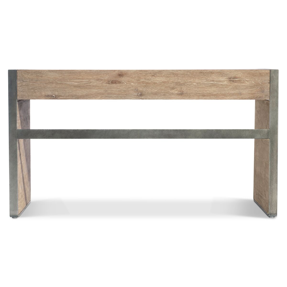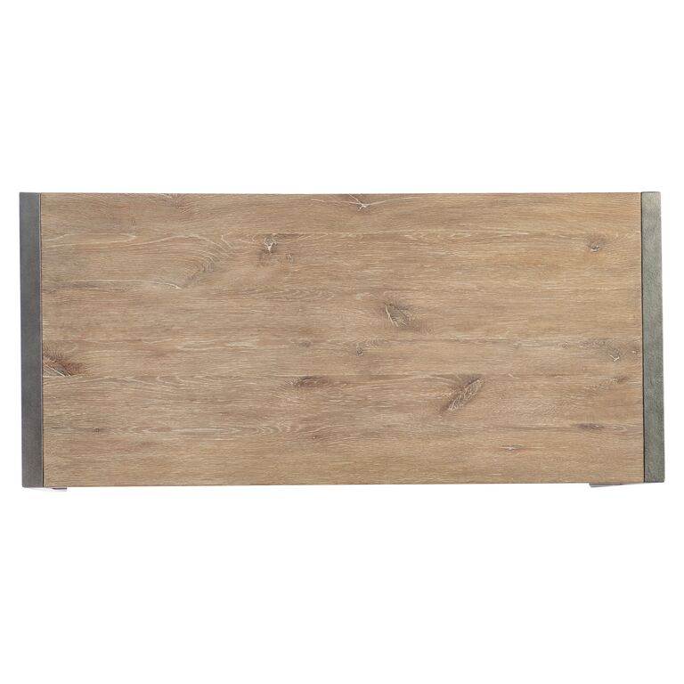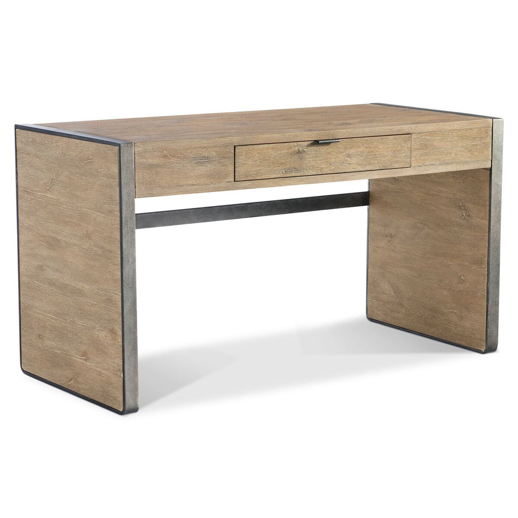 Wire Brushed Oak Desk In Aurum Finish. One Pull-To-Open Drawer With Tab Pull In Barlow Finish. Applied Texture Steel Base In Barlow Finish. Adjustable Glides.