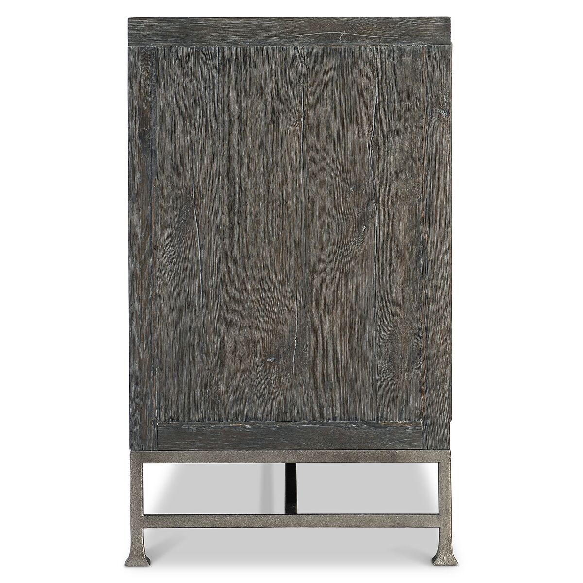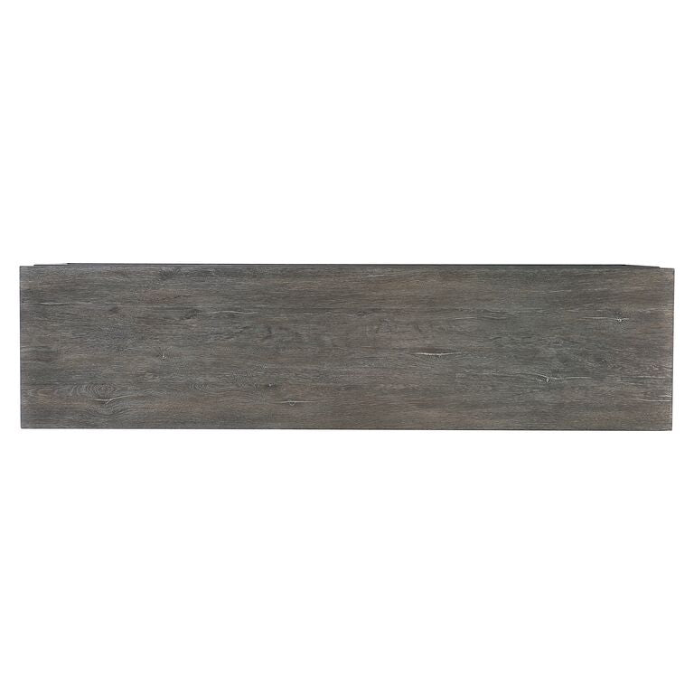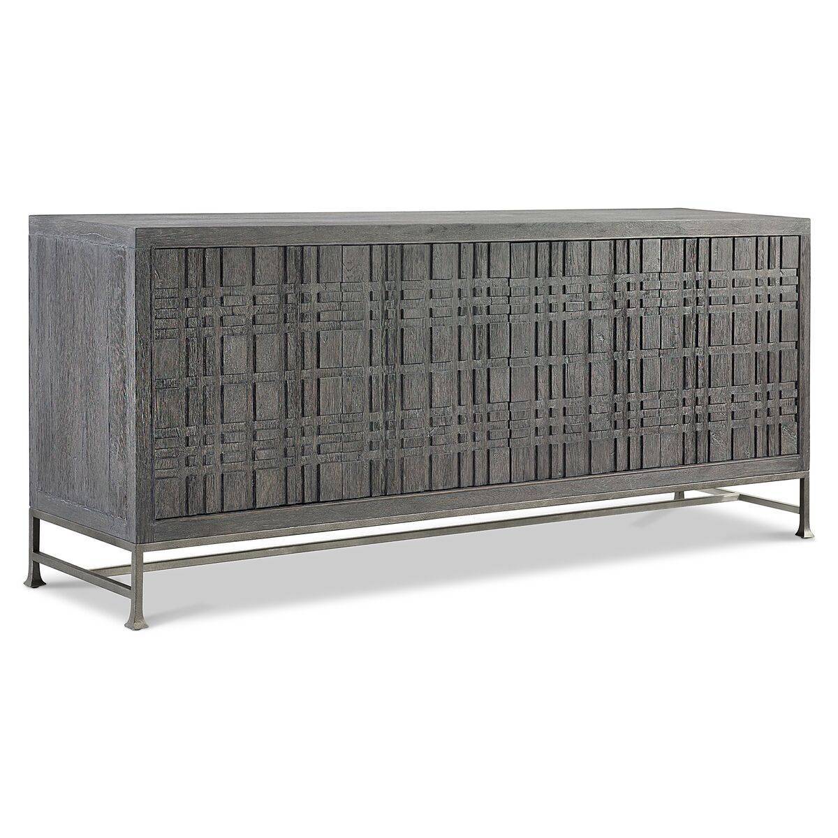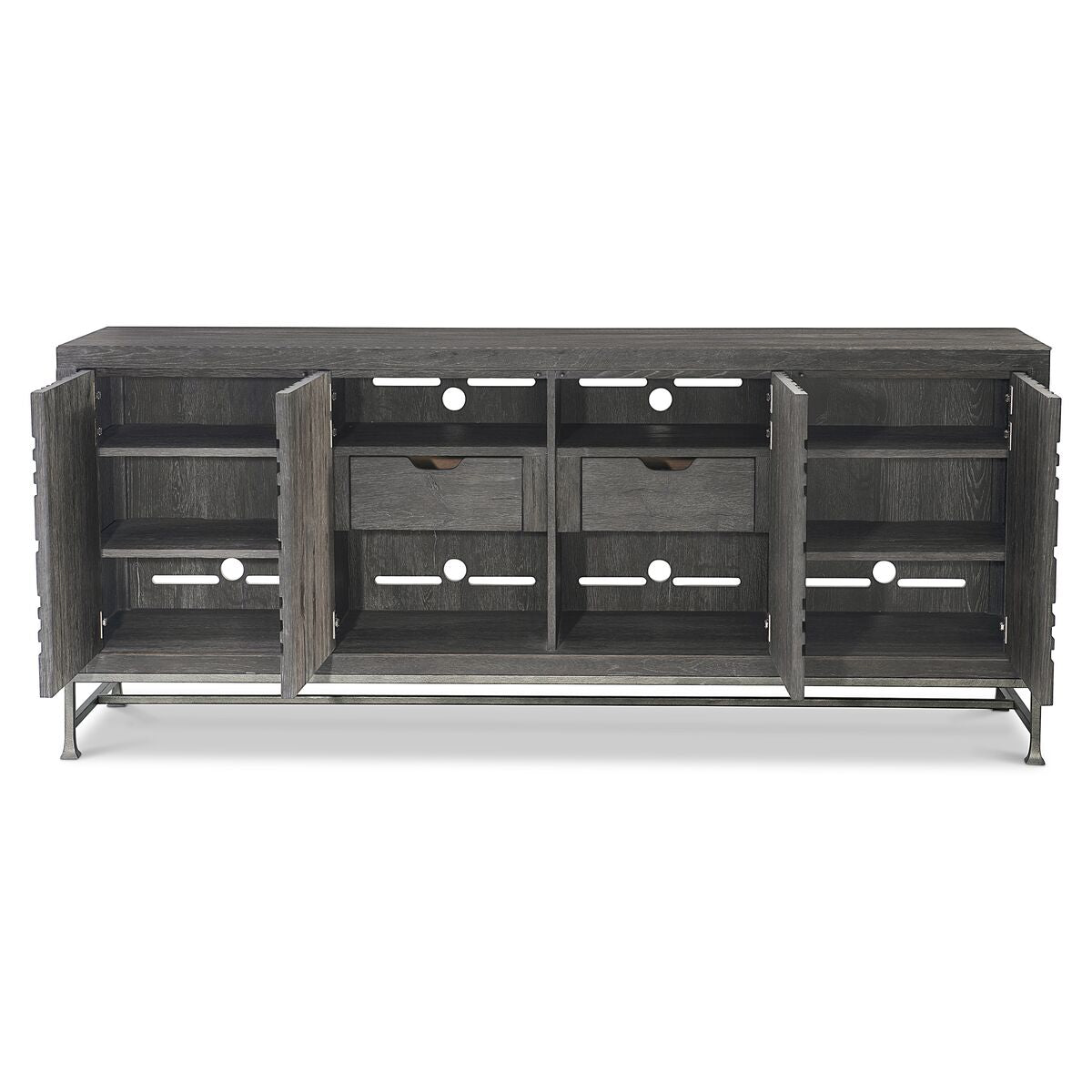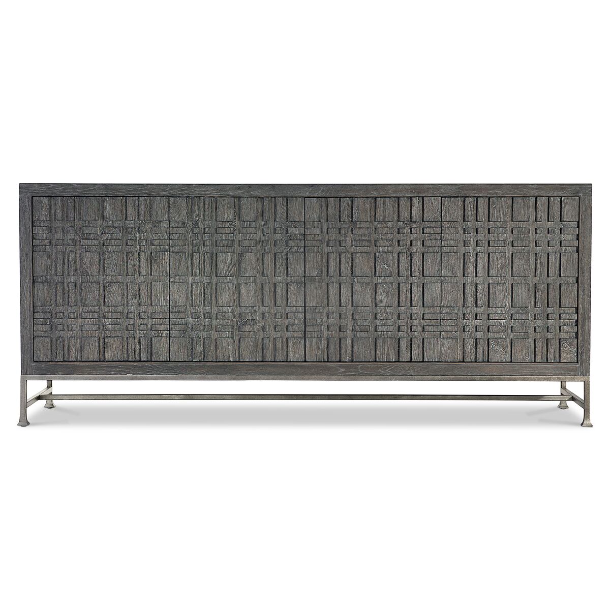 Wirebrushed Oak Entertainment Credenza In Tadon Finish With Four Push-To-Open, Soft-Close Doors With Raised Geometric Pattern. Two Pull-To-Open, Soft-Close Drawers. Six Covered Grommets And Vents. Adjustable Shelves. Applied Texture Steel Base In Barlow Finish. Adjustable Glides.