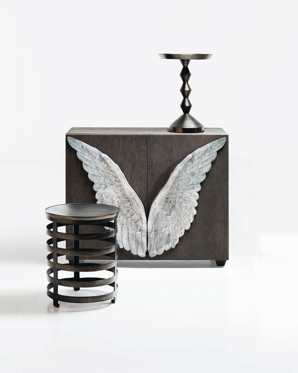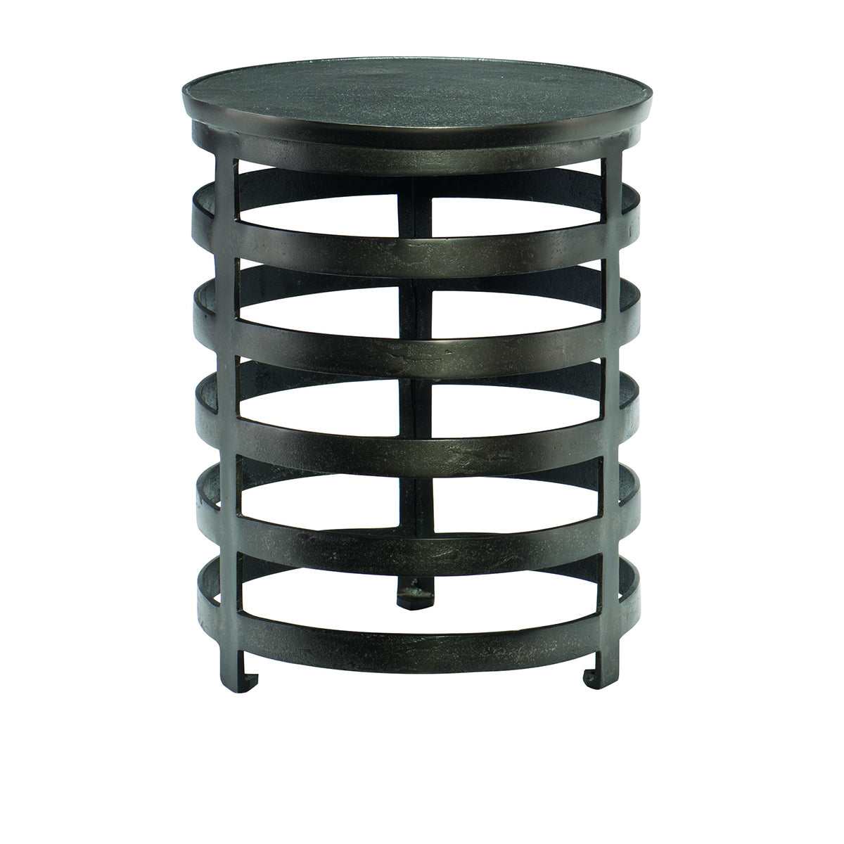 Bernhardt Interiors offers an eclectic array of artistic tables with a distinctly modern style. Functionality meets high design with the Apsley chairside table. Sculptural in form, it features a circular top supported by a base of five "floating" circles. Contributing to the unique character of this piece, a black nickel finish on cast aluminum adds texture and industrial appeal.
