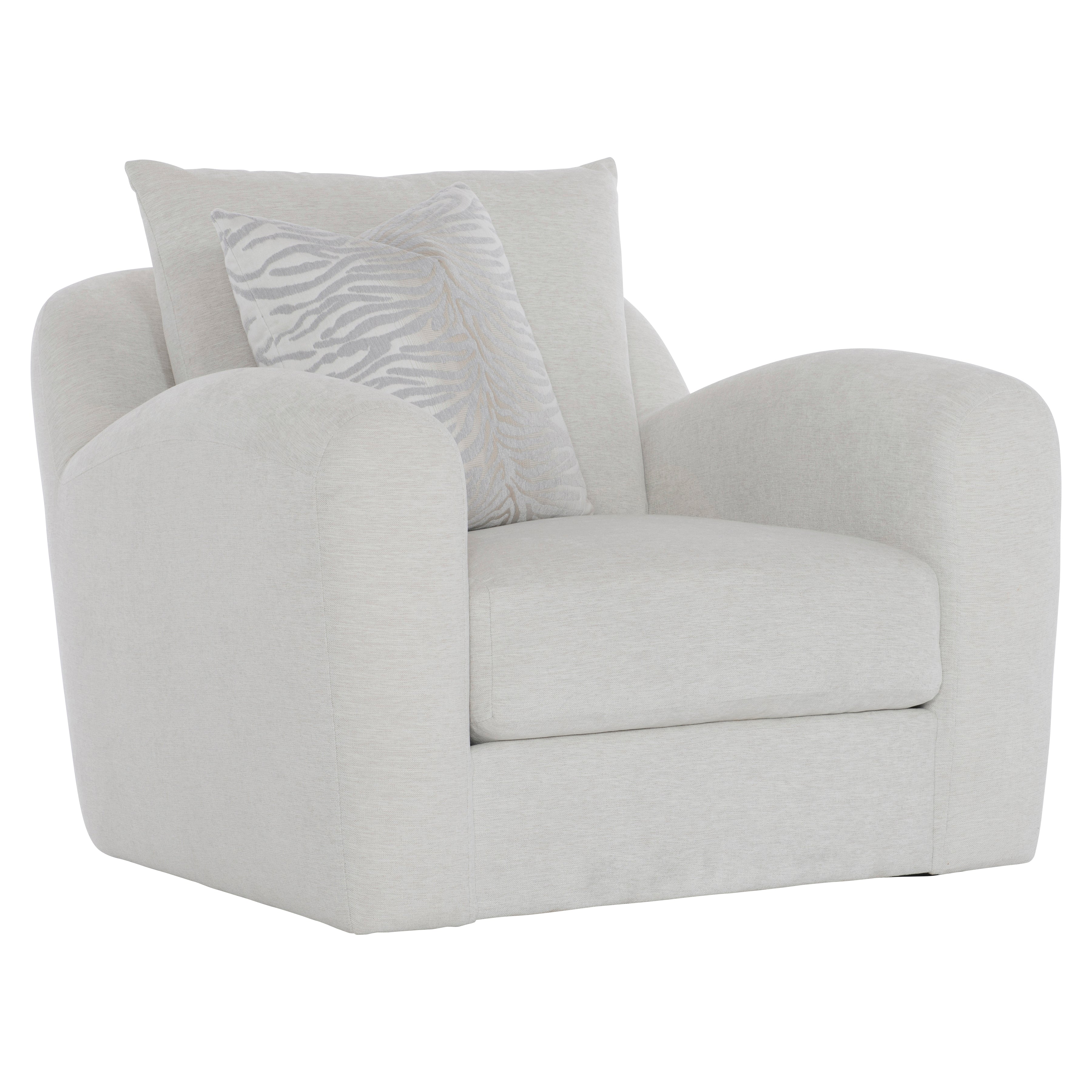 The Asher swivel chair has a unique frame with high-loft curved arms and a shaped back. Comfort comes from a knife-edge back pillow, and a Blendown throw pillow. The enticing shape, swivel base, and deep seat create a luxuriously restful statement.