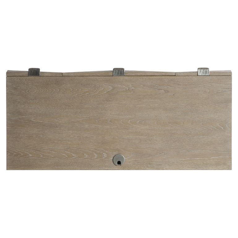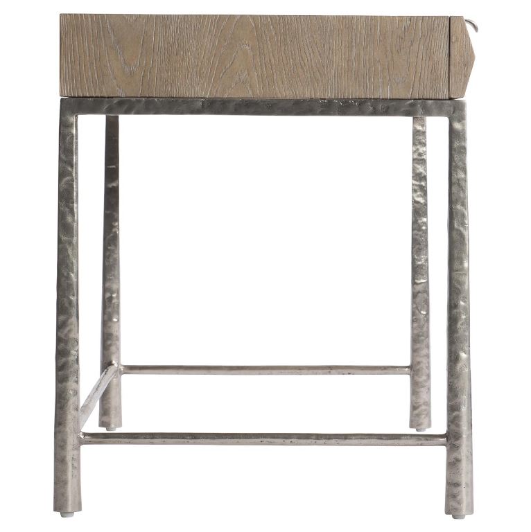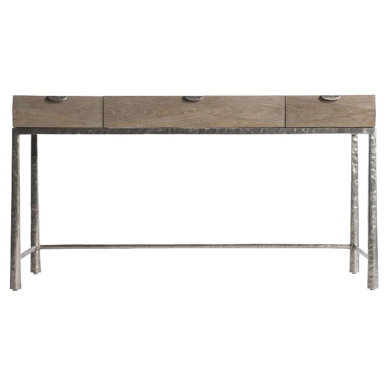 A beautiful textured aluminum frame supports a wood top on the Aventura desk. The dimensional shaping on the desk top's three drawer fronts complements the tapered legs. A power unit on the top offers function with two USB ports and two outlets.