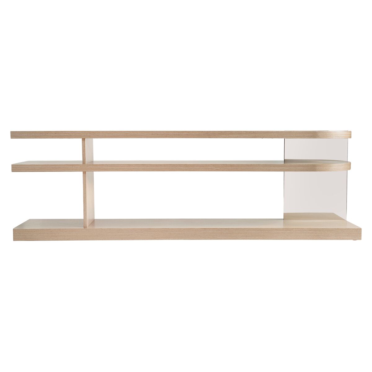 Modern art informs the chic and unique Modulum console table. A shaft of stainless steel reflects the rounded corners and sharp lines of the Calder-esque design, while a wood panel supports the opposite side of the shelves. The metal panel pierces the console's top as well, showcasing a sharp signature for the Modulum collection.