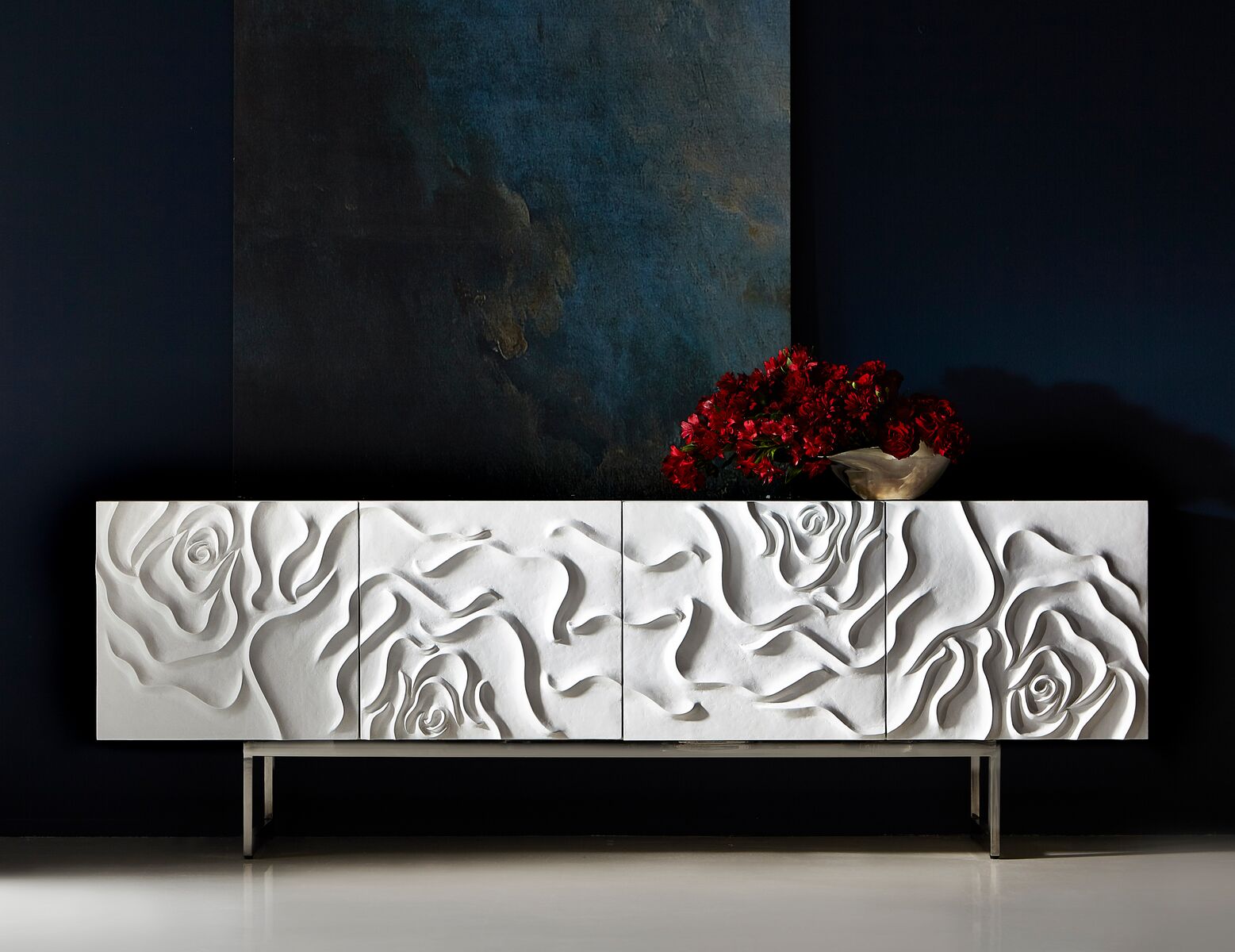 This stunning modern credenza makes an elegant statement with a floral pattern carved in white plaster. In an elegant floral motif, graceful swirls curve across the front of the Penrose credenza. The white plaster finish is bright and refreshing, while the polished stainless steel base is sleek and shiny with clean, modern lines. Four soft-closing doors open to reveal adjustable, removable shelves and grommet holes for wire management.