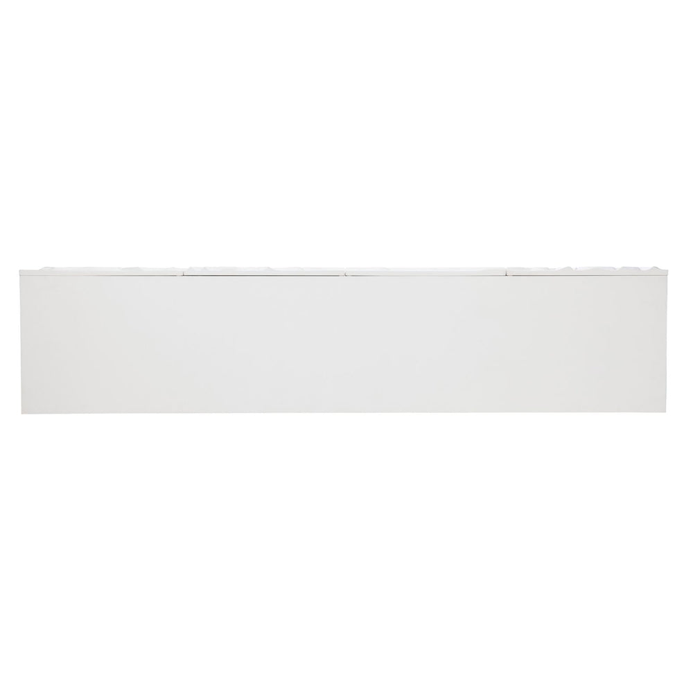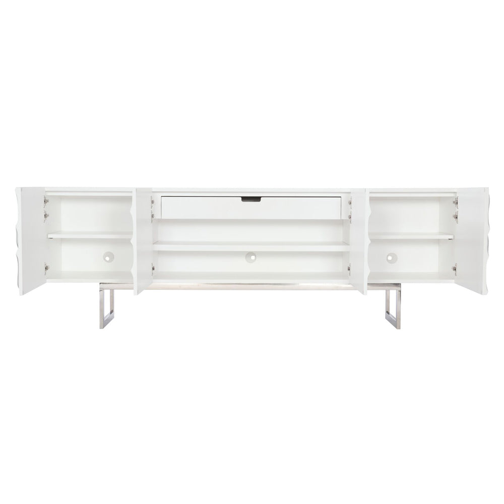 White Plaster Finish. Four Soft-Closing Doors With Dimensional Floral Design Fronts. Behind End Doors Is One Adjustable/Removable Shelf And One Grommet Hole In Back Panel. Behind Paired Center Doors Is One Adjustable/ Removable Shelf, One Drawer With Hand Cut-Out And One One Grommet Hole In Back Panel. Felt Tabs Behind Doors. Polished Stainless Steel Base. Adjustable Glides.