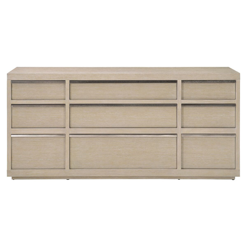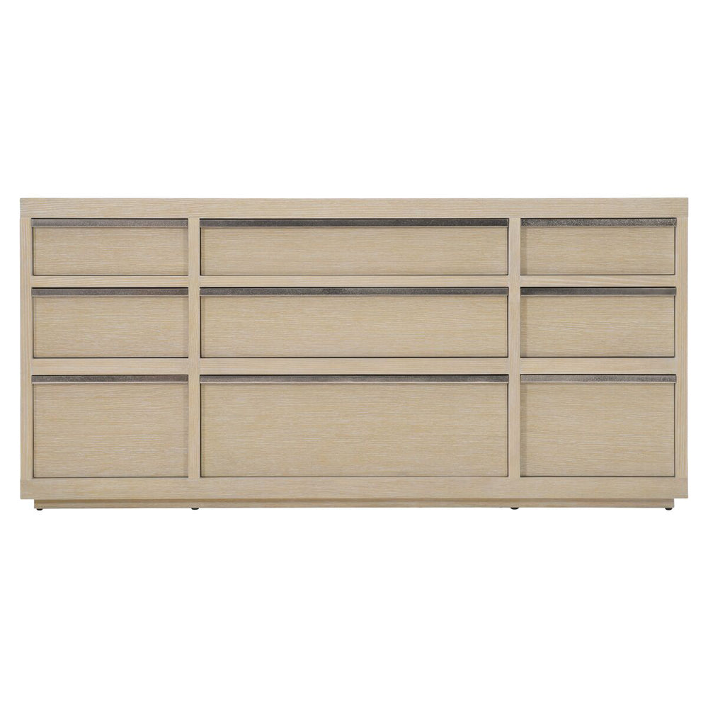 Sleek shaping and subtle detailing create a simply stunning nine-drawer dresser. Subtlety defines the Solaria dresser, crafted from ash solids and quartered white oak veneers in a Dune finish. At first glance, it appears to be an all-wood design, but the quiet sheen of the metal finger pulls draws the eye and defines the form. Nine drawers in varying sizes create essential bedroom storage.