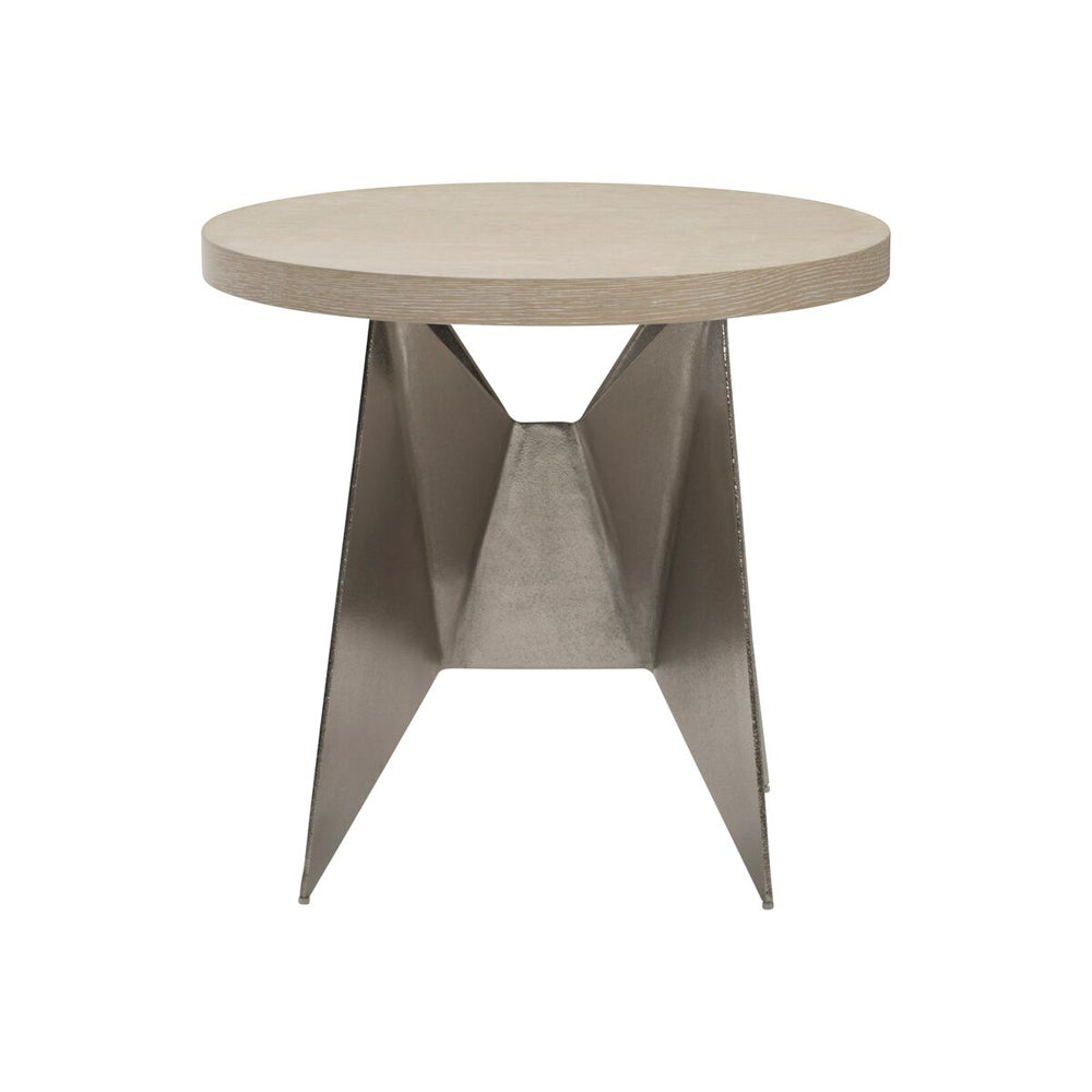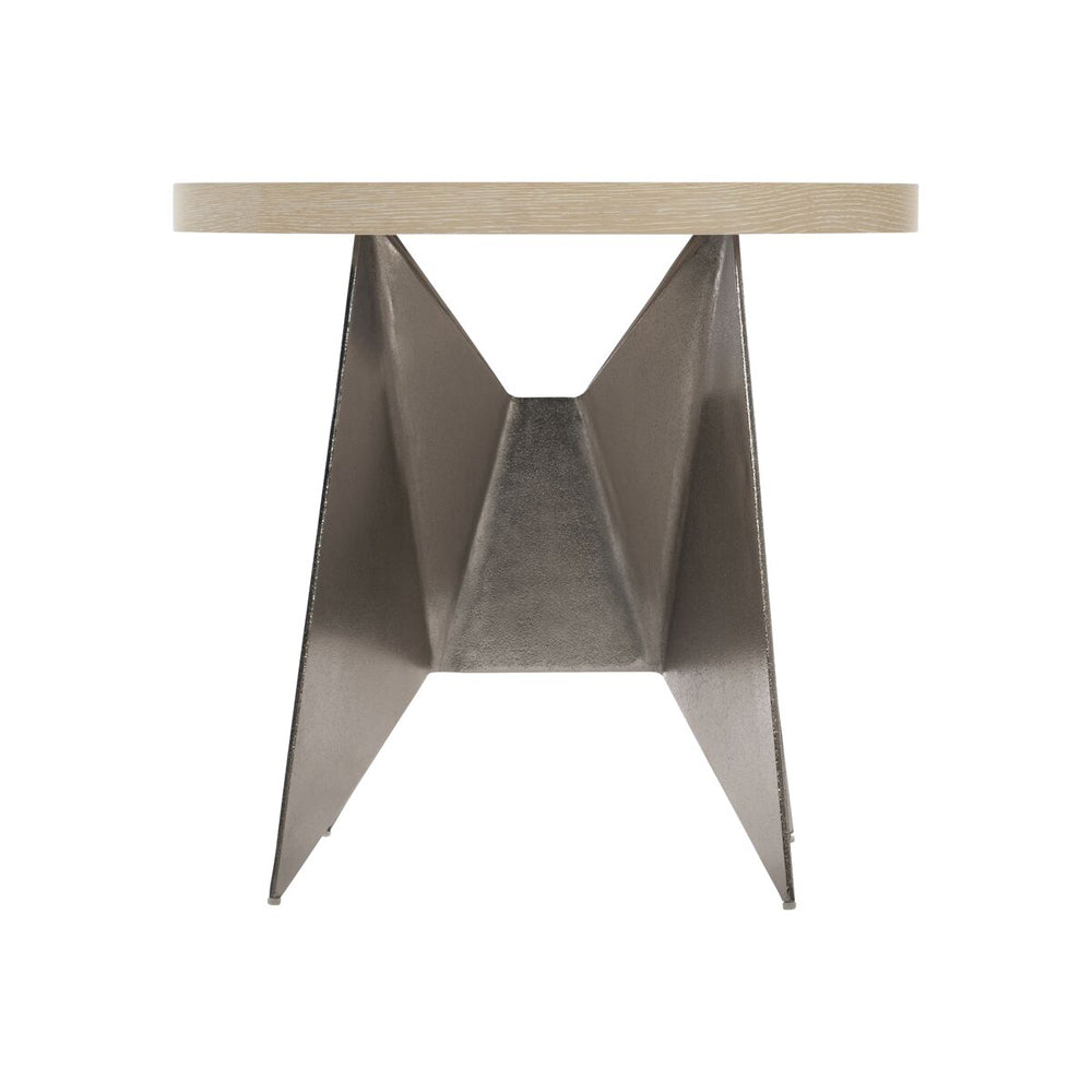 A geometric shaped metal base provides stuninng support on this side table. The precise folds of origami are the inspiration for the geometric base on the Solaria side table. Cast in aluminum with a shiny nickel finish, the stunning support draws all eyes, while the circular wood top balances the look with a softened counterpoint, featuring quartered white oak veneers in a Dune finish.