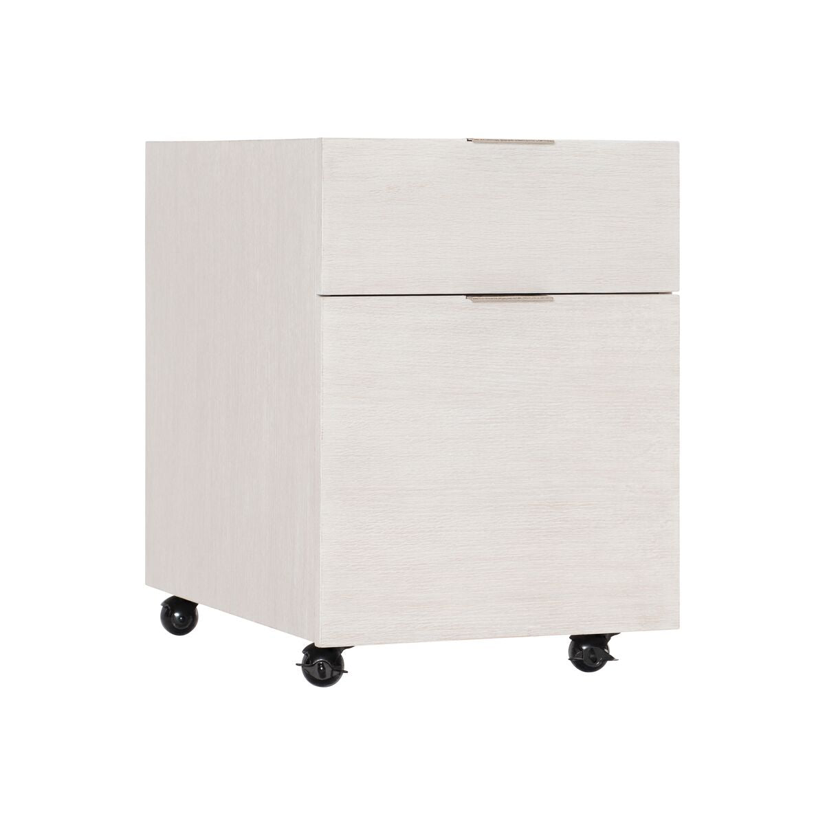 The Solaria file cabinet is clean, simple and essential. Featuring quartered white oak veneers in a Weathered Bone finish, the cabinet houses two office drawers with sleek metal hardware in a shiny nickel finish. The bottom drawer includes removable hanging rods for letter or legal files. Rolling casters create mobility.