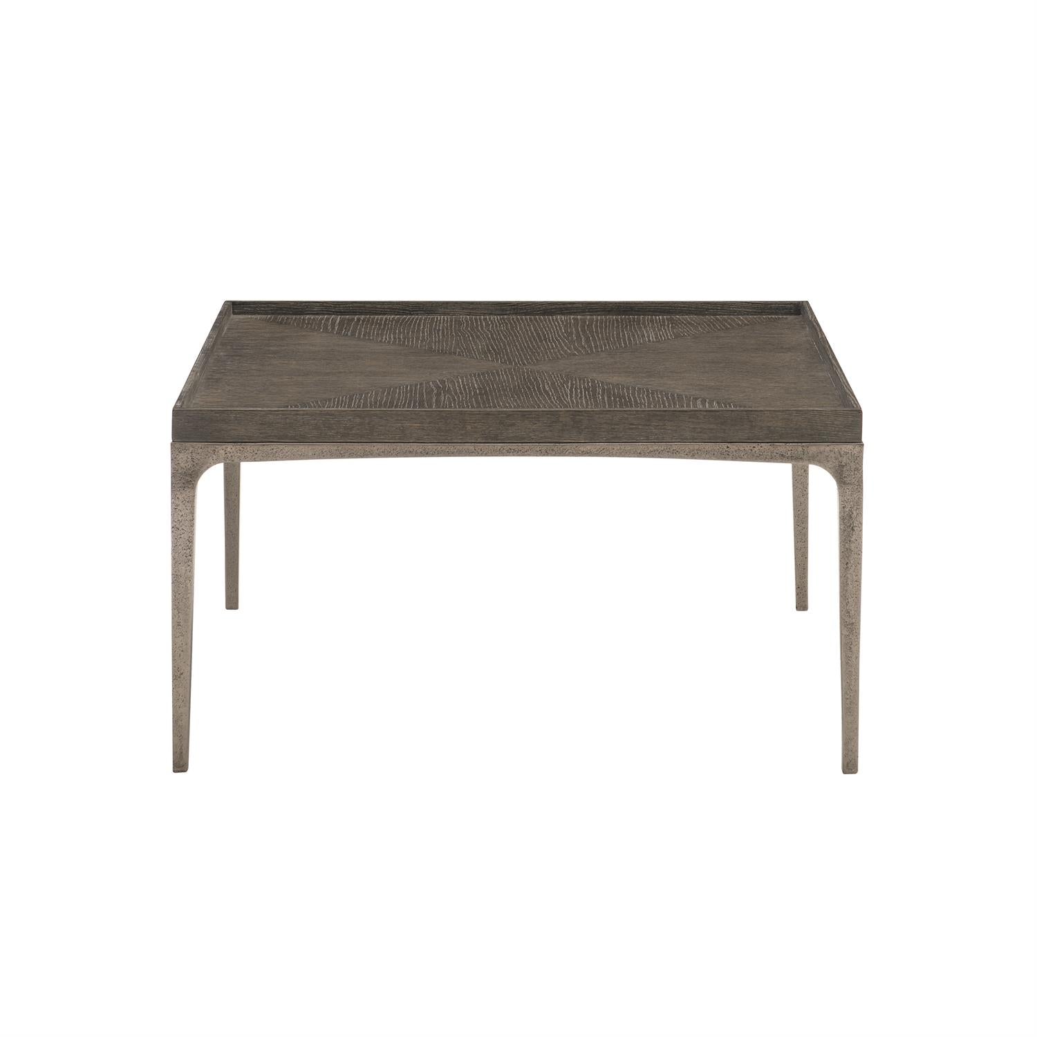 Bernhardt Interiors offers high-design furniture with an eclectic edge. The Strata cocktail table melds rustic and contemporary styling in an unforgettable design. An elegant rectangular Black Forest marble top boasts black-and-white veining in a pattern reminiscent of wood grain. Crafted from solid cast aluminum in a Textured Graphite finish, the slender four-leg base represents a harmony of modern minimalism and industrial style.
