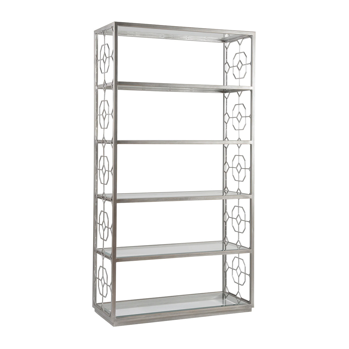 Hand-forged iron frame with six stationary, 1-inch beveled, tempered glass shelves. Shown in the Argento finish, an antiqued silver with gold undertones. HONEYCOMB - 2056 Hand forged iron bases and beveled glass tops and shelves Hand-forged iron frame, 6 stationary beveled glass shelves. , METAL DESIGNS