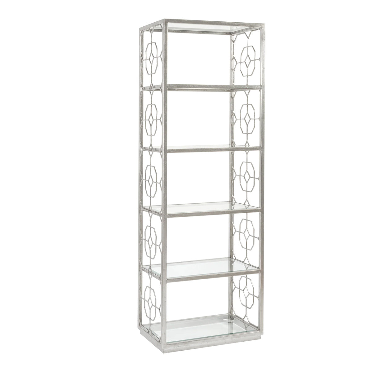 Hand-forged iron frame with six stationary, 1-inch beveled, tempered glass shelves. Shown in true silver leaf with antiqued effect, but also available in all Artistica Metal Designs finishes. HONEYCOMB - 2056 Hand forged iron bases and beveled glass tops and shelves Hand-forged iron frame, 6 stationary beveled glass shelves , METAL DESIGNS ,