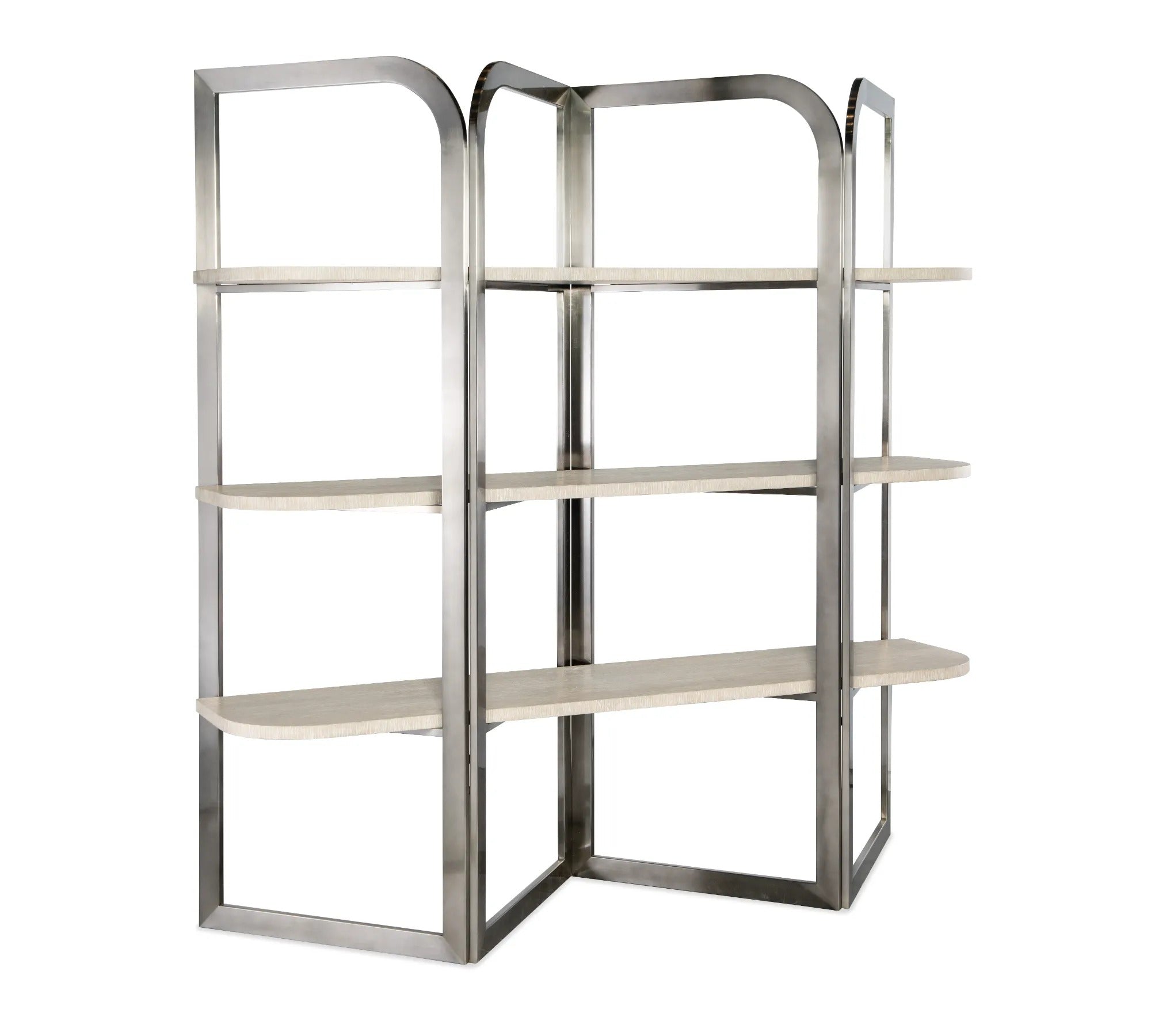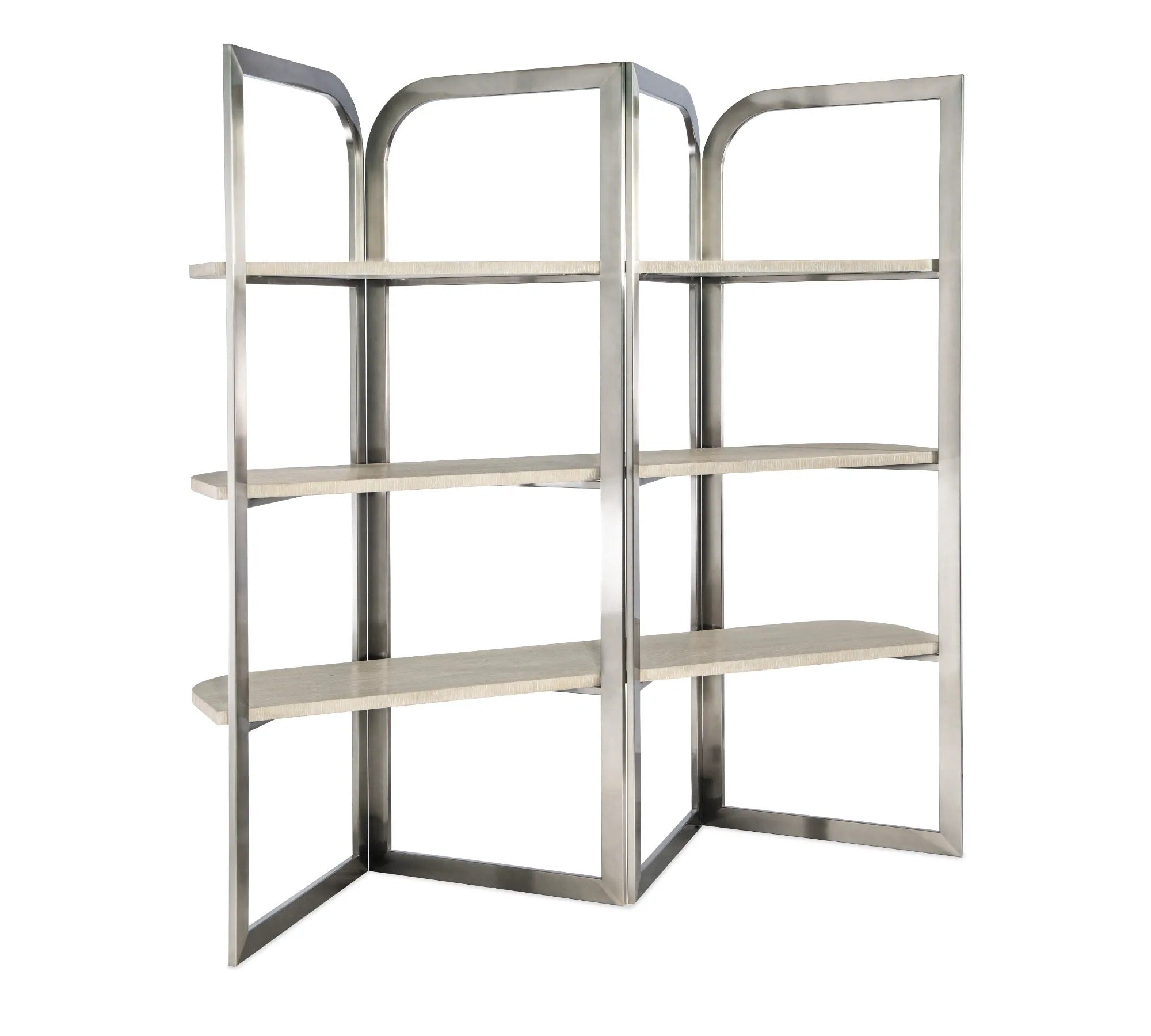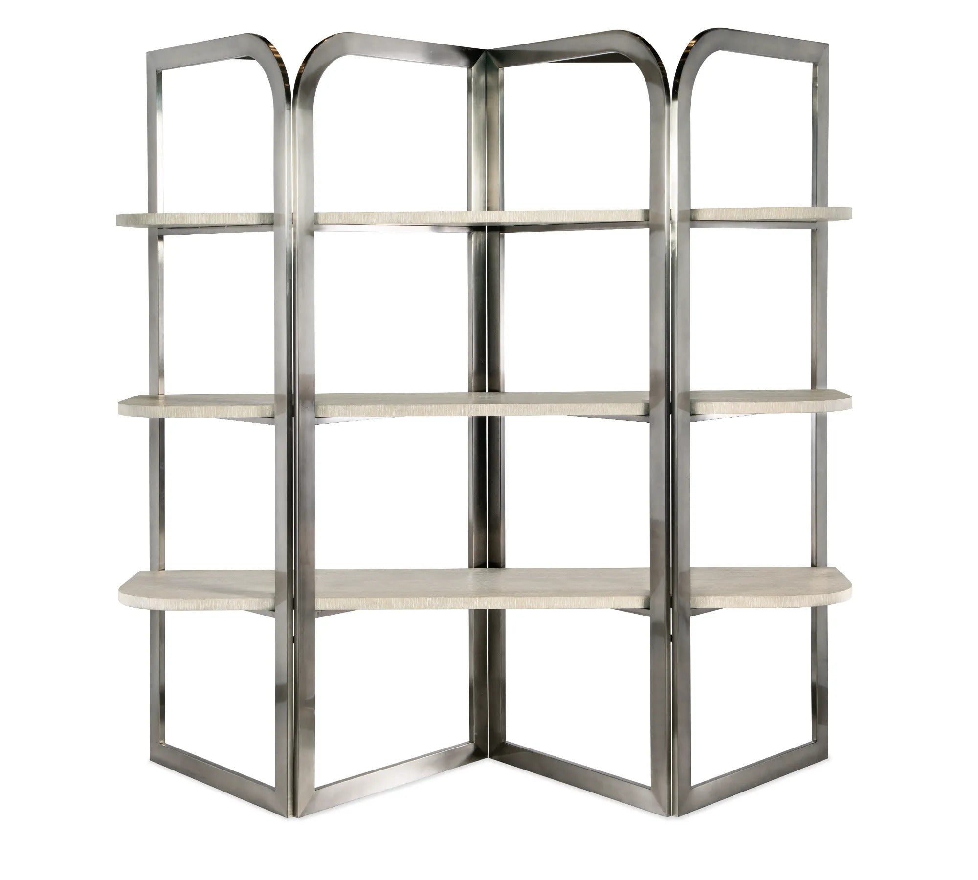 Architectural and artistic with a luxe mixture of materials, the Modern Mood Etagere has three fixed shelves crafted of wire-brushed Quartered Oak in the Diamond finish with alabaster and pewter hues. The shelves are surrounded by a shaped brushed metal frame in a warm pewter-colored finish. Finished all the way around, the shelf can be used from either side and can float in a room.