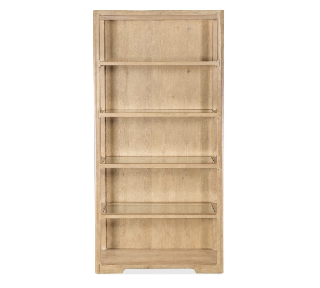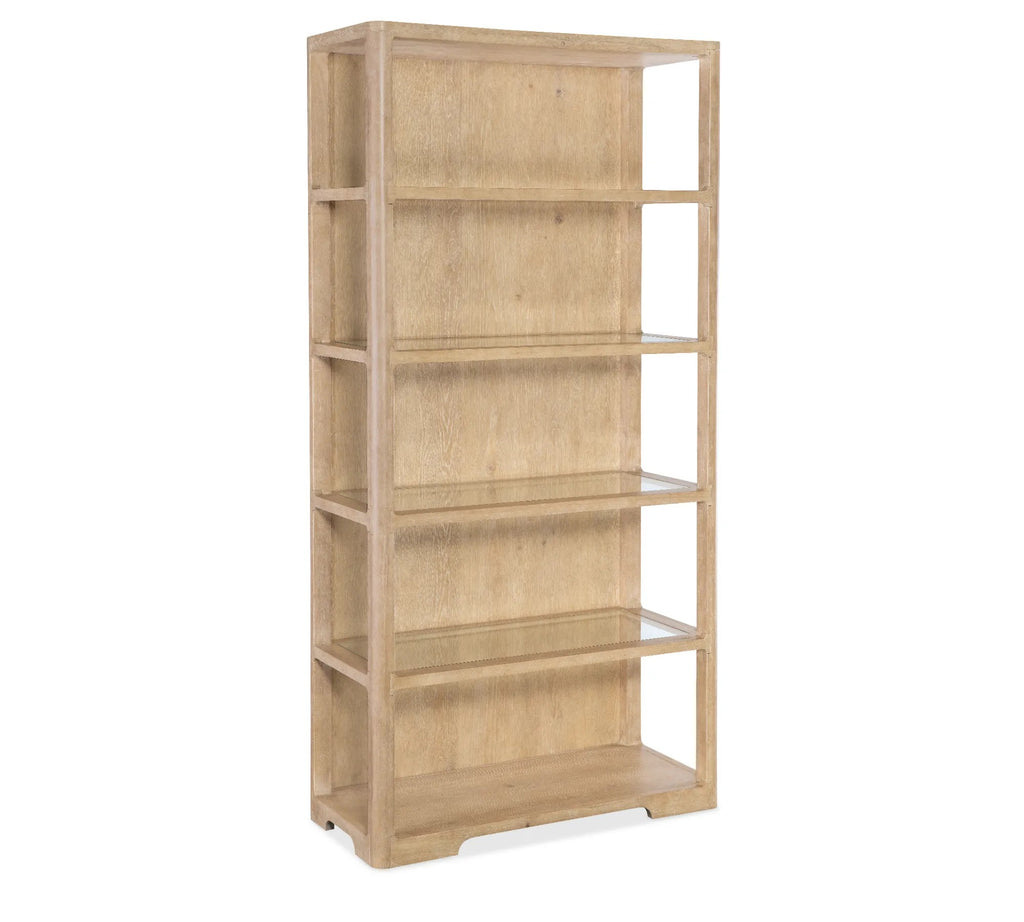 Inspired by tranquil, tropical resort destinations, the Retreat Etagere will help you create a peaceful setting in your home. Featuring four fixed wood-framed tempered glass shelves, the etagere is crafted of Oak Veneers finished in the sand-colored Dune finish, transparent by design to showcase the unique patterns of the wood veneer.