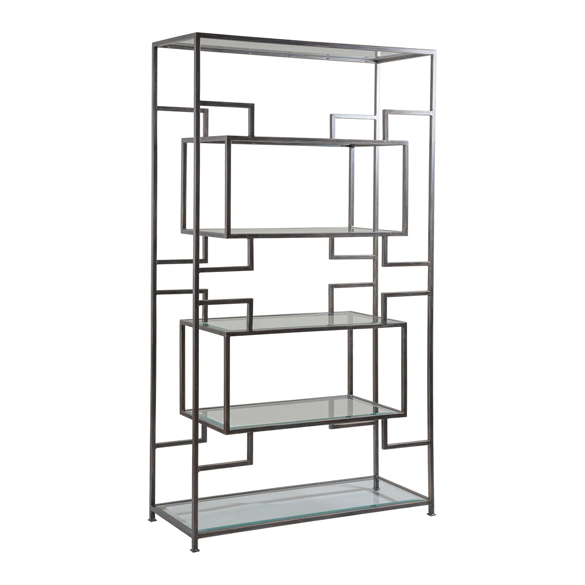 Dramatic linear architectural form constructed of tubular steel in the St Laurent finish, a rich natural tone with touches of light gesso and gold highlighting. The tubular steel frame features six inset glass shelves, all tempered with 1-inch bevels, providing ample display. Available in all Artistica Metal Designs finishes. SUSPENSION - 2006 Dramatic linear architectural forms constructed of tubular steel and inset beveled glass. . . Tubular steel frame, 6 inset glass shelves. , METAL DESIGNS