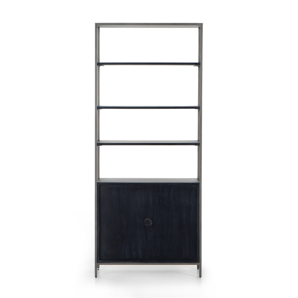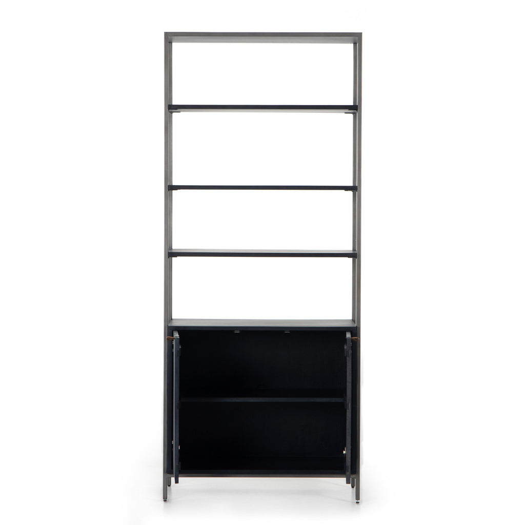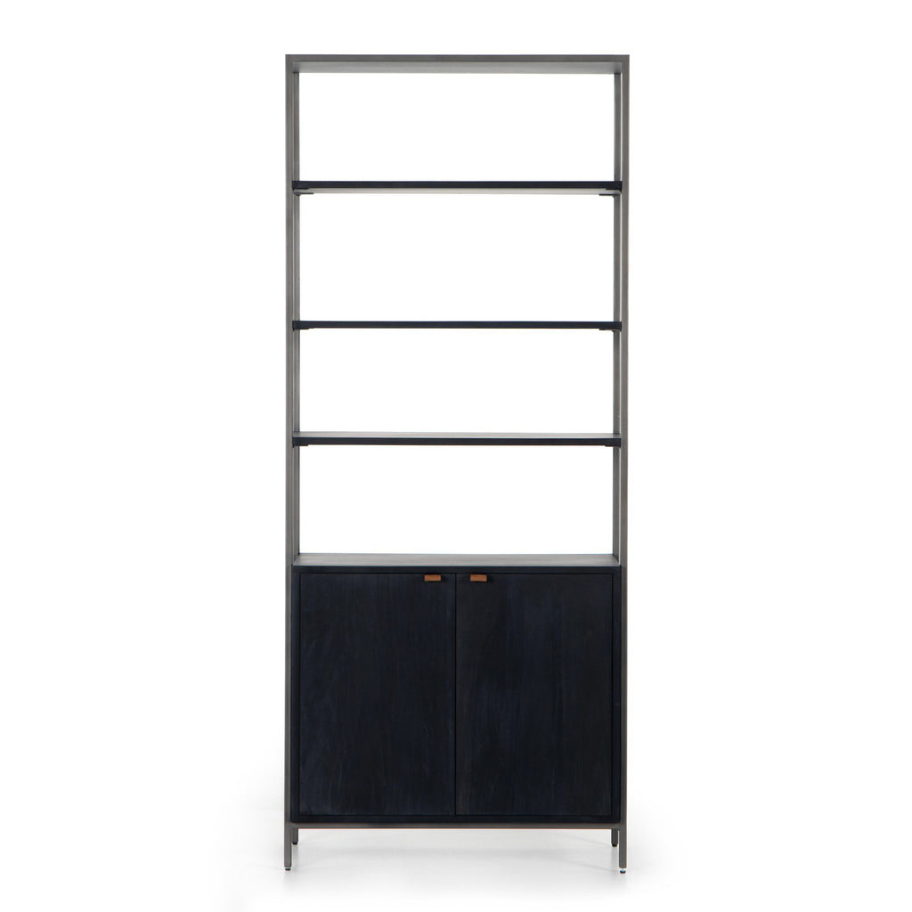 Inspired by clean midcentury design, solid black wash poplar and raw iron fuse to offer storage and display space for favorite books and treasures. Metal-secured leather pulls add a textural element of surprise. Great alone or doubled and paired with matching media console.