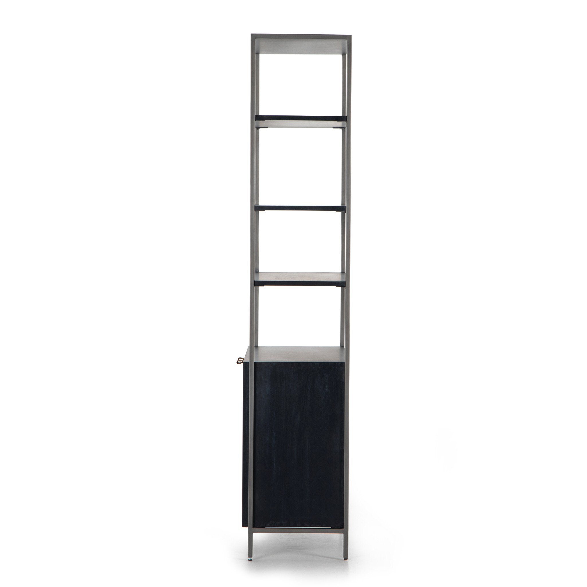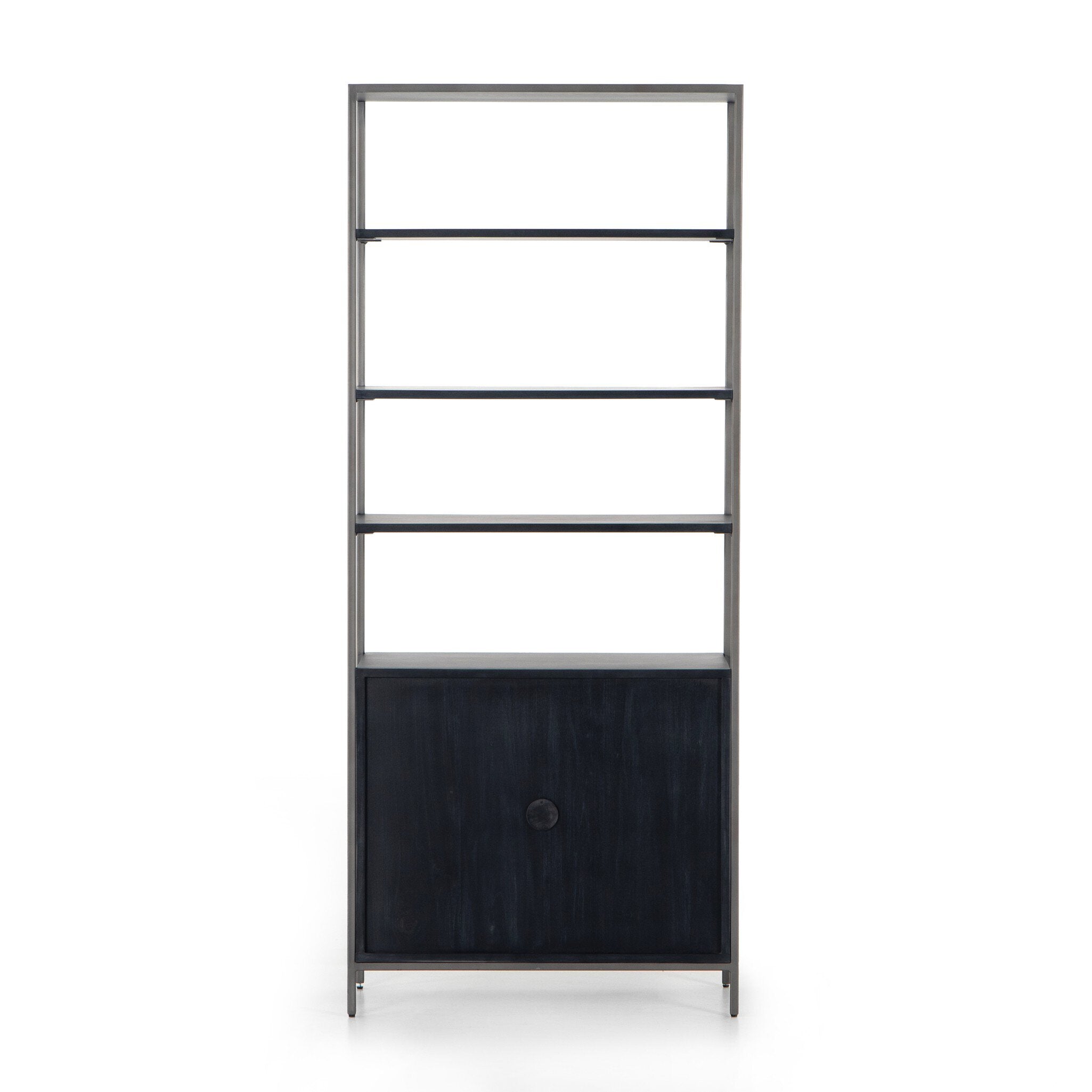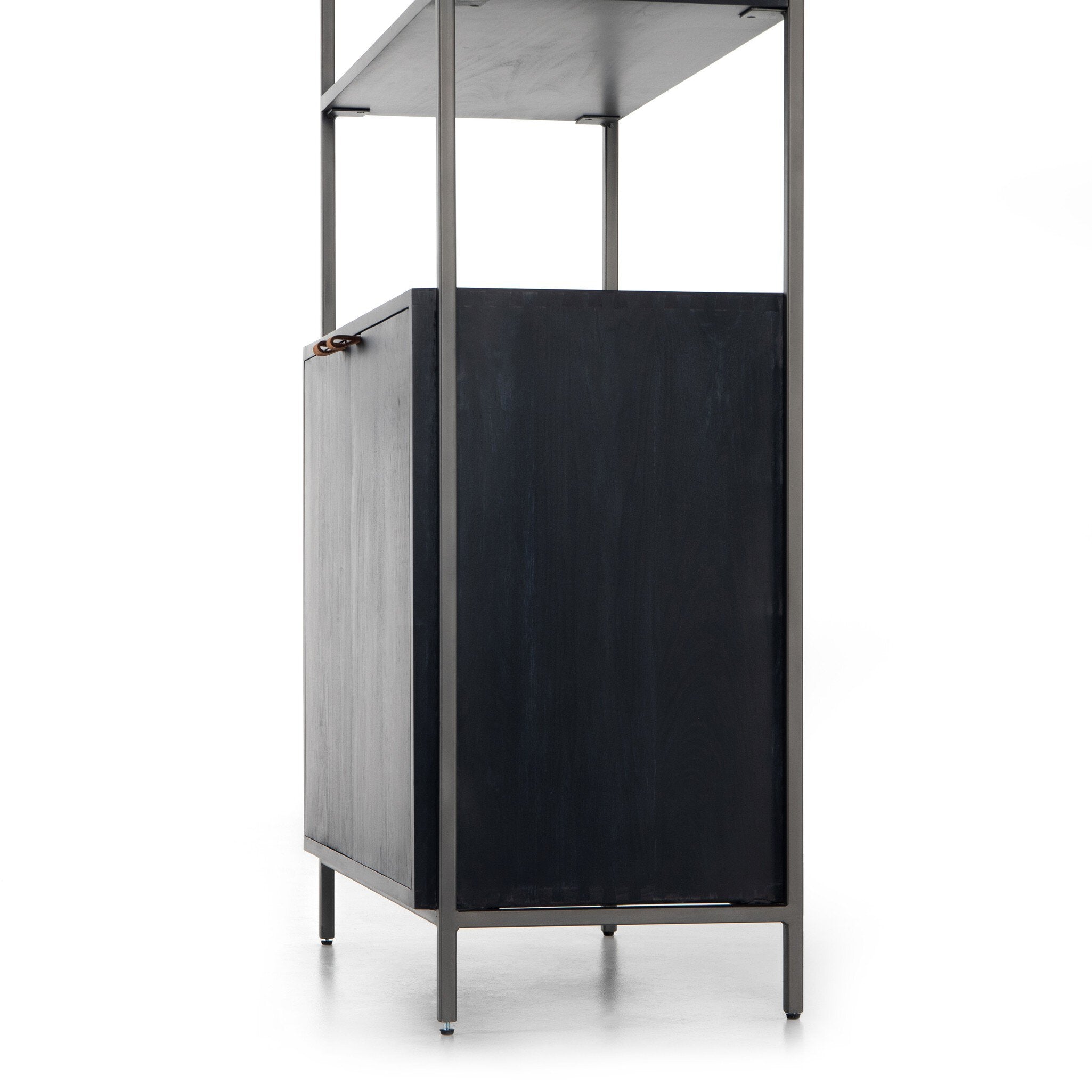 Inspired by clean midcentury design, solid black wash poplar and raw iron fuse to offer storage and display space for favorite books and treasures. Metal-secured leather pulls add a textural element of surprise. Great alone or doubled and paired with matching media console.
