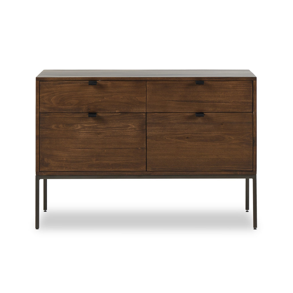 Inspired by midcentury design, auburn-finished poplar offers ample file storage space, with a fully finished back. Metal-secured leather pulls add an element of surprise. Great solo or paired with matching desk or credenza.