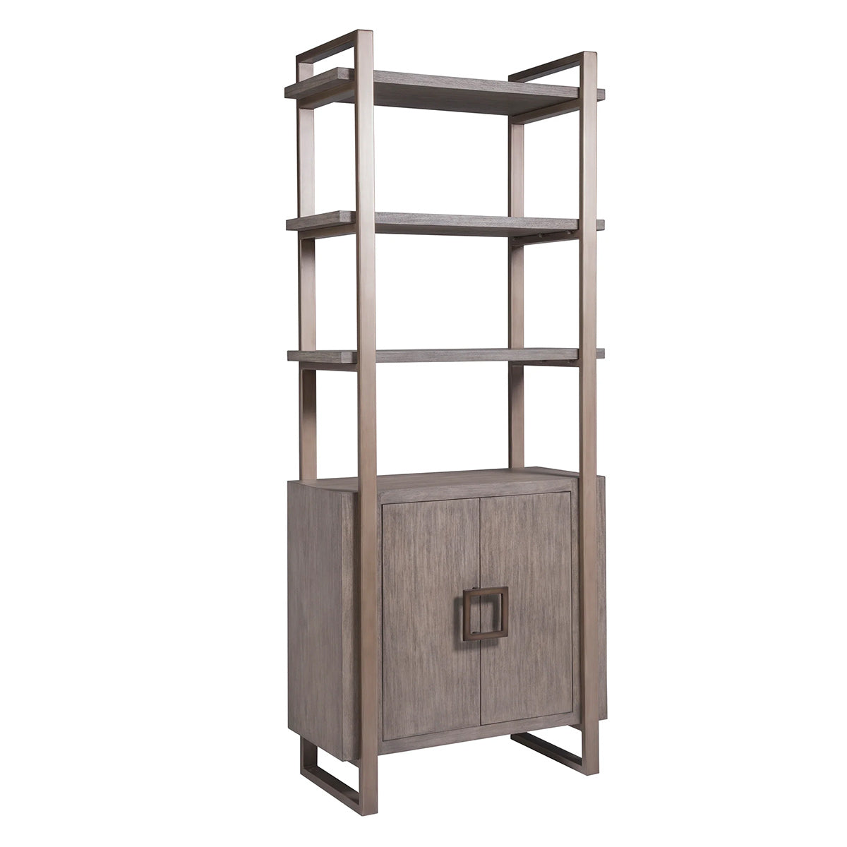 Mahogany solids and veneers with hand wire brushed graining balance the metal frame and hardware in a warm metallic, hint of copper, finish. The upper section features three stationary woooden shelves and the two doors open to two adjustable shelves. Available in all three Cohesion finishes - Bianco, Grigio, and Marrone. Metal frame and hardware in a warm metallic finish with a hint of copper Upper section: 3 stationary wooden shelves. Lower section: 2 doors, 2 adjustable wooden shelves behind doors. , COHESION PROGRAM ,