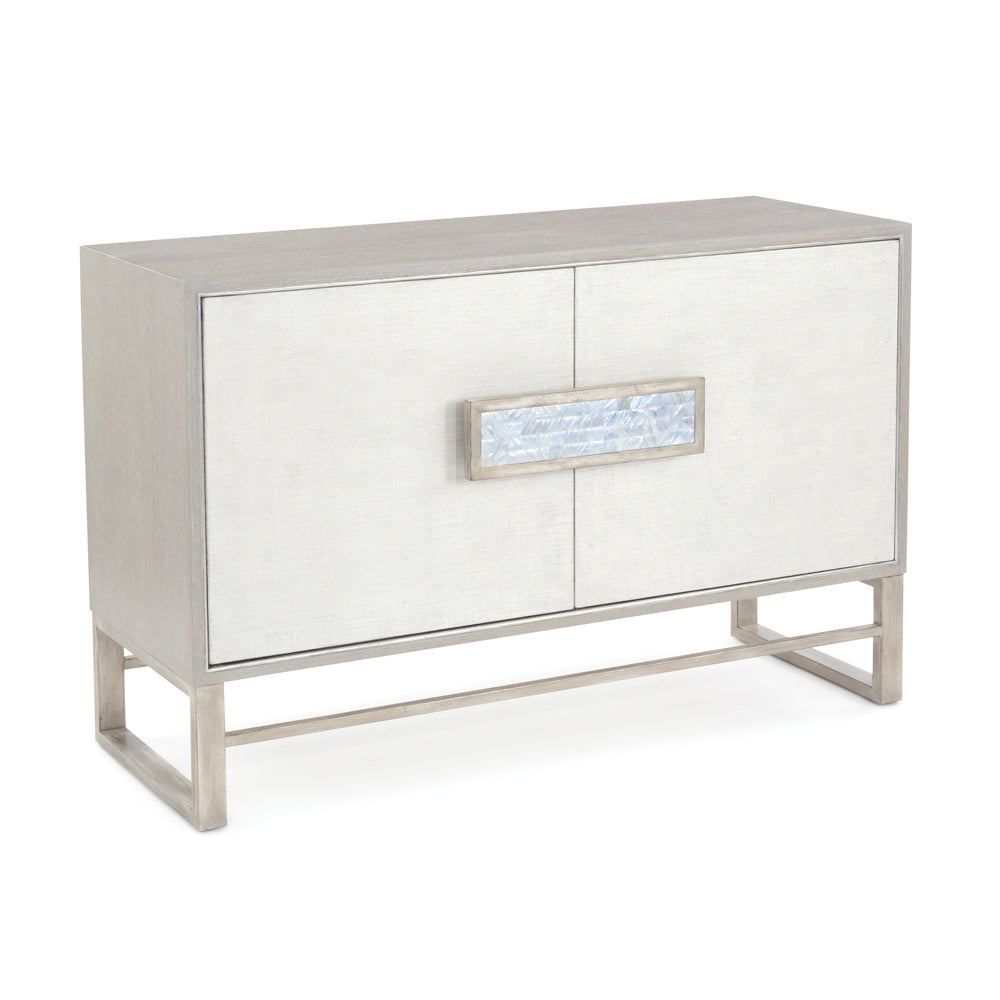 This two-door cabinet features an oak veneer and a steel base. The case is finished in grey oak, while the doors are in white linen with silver cerusing. A single handle with inlaid mother-of-pearl is mounted across the doors. The handle molding and steel base are in silver white.