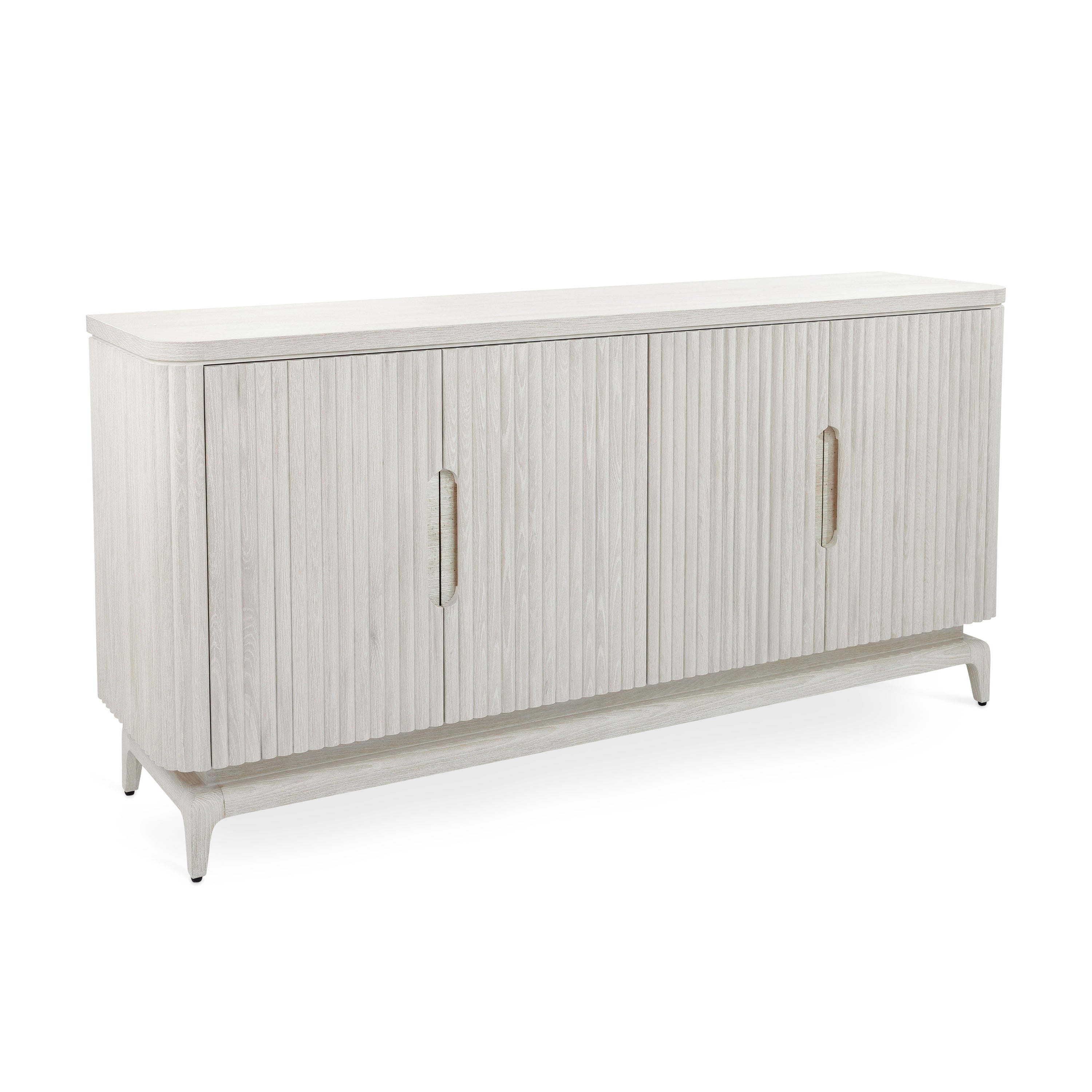 The Brezza Credenza is an elegant contemporary design showcasing sophisticated neutral tones. Crafted from oak wood with a gorgeous White Washed finish, the frame demonstrates a fluted pattern adorning the four cabinet doors. Both pairs of doors feature groove handles with steel inlays, revealing a tasteful striped pattern finished in a Natural Silver finish. This delicate statement piece possesses two interior compartments with a single adjustable shelf.
