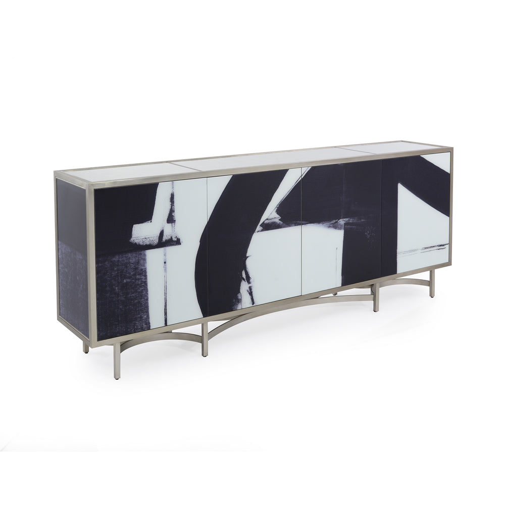 This four-door sideboard in pewter is finished with a top in clean A glomisA . The glass door fronts of this piece are printed with a reproduction of Carol Benson-Cobb's painting Entanglement.