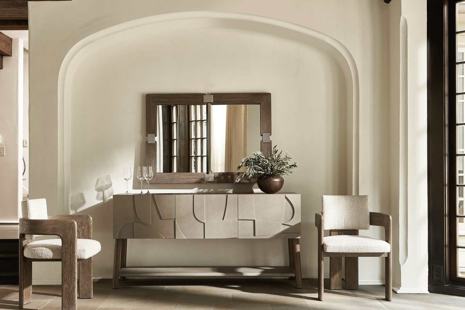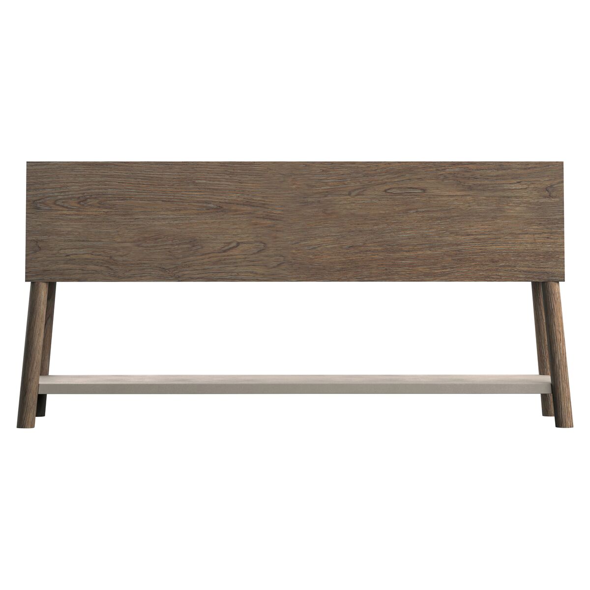 Texture and dimension carve a signature look onto the Casa Paros sideboard. Three cast resin faux concrete soft-close doors are refined in Bedrock finish. The top and splayed legs feature the warm Playa finish, and a bottom shelf is also finished in Bedrock. Behind each door are adjustable and removable shelves.