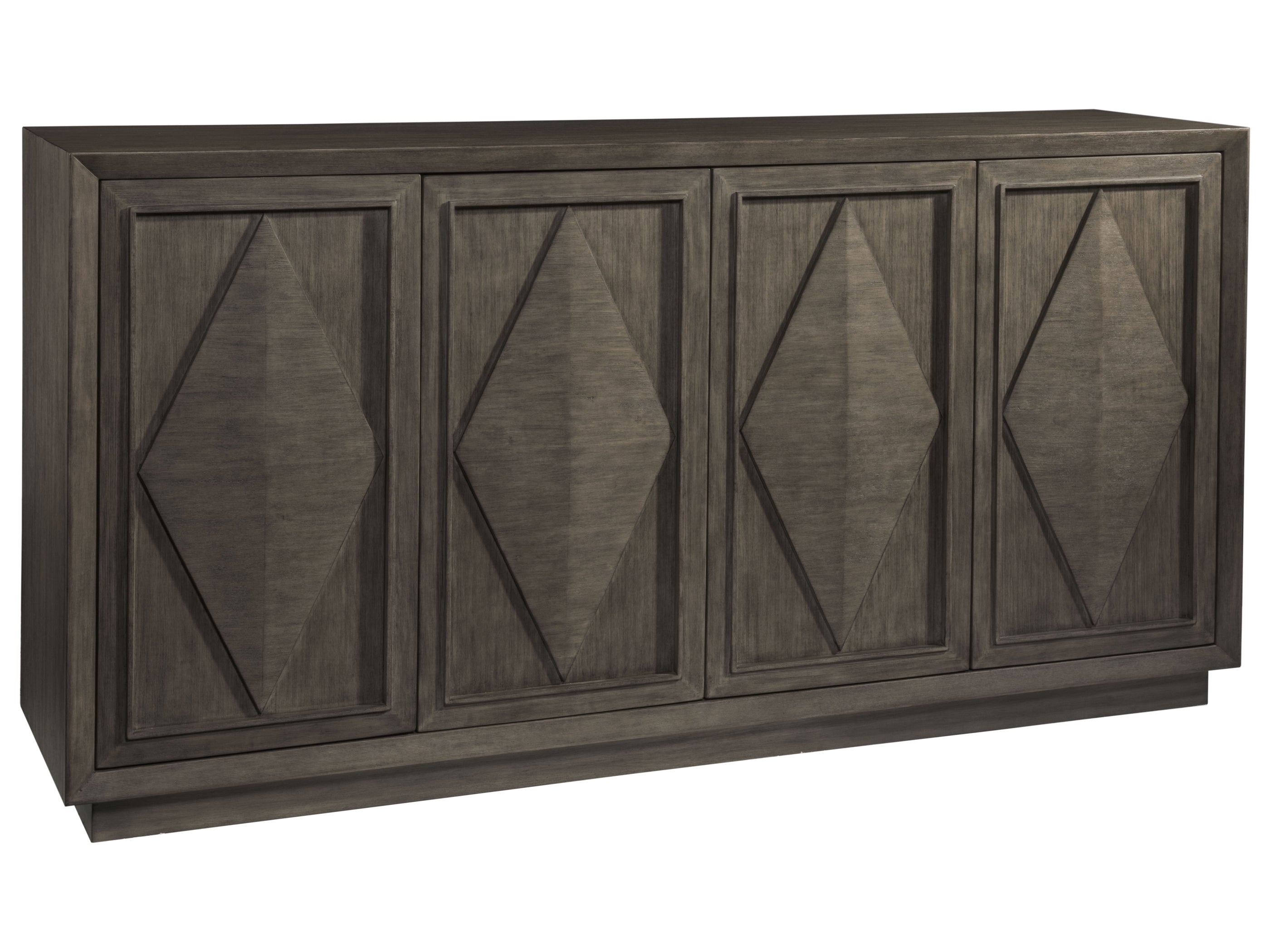 Transittional design in mahogany solids and veneers, and select hardwoods finished in a warm gray tone with wire brushing, our Grigio finish. The four doors have a diamond pattern overlay, and open to two felt lined drawers (one divided for silver), four adjustable shelves, sliding ventilated back panel for wire management. Four doors with diamond pattern overlays, 2 felt lined drawers (1 divided for silver), 4 adjustable shelves, ventilated back, grommet for electrical cords. . , COHESION PROGRAM ,