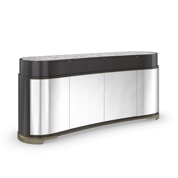 With the iconic appeal of a polished metal ice bucket, this sleek sideboard mixes elegant design with unexpected materials. Its classic kidney bean shape is punctuated by an Almost Black finish and shimmering silver door fronts framed in a bead of Brushed Gold. More than just gloss and glamour, its spacious interior offers ample room for keeping entertaining essentials, and a Snow Fox stone top lends a luxe yet durable surface for serving and display.