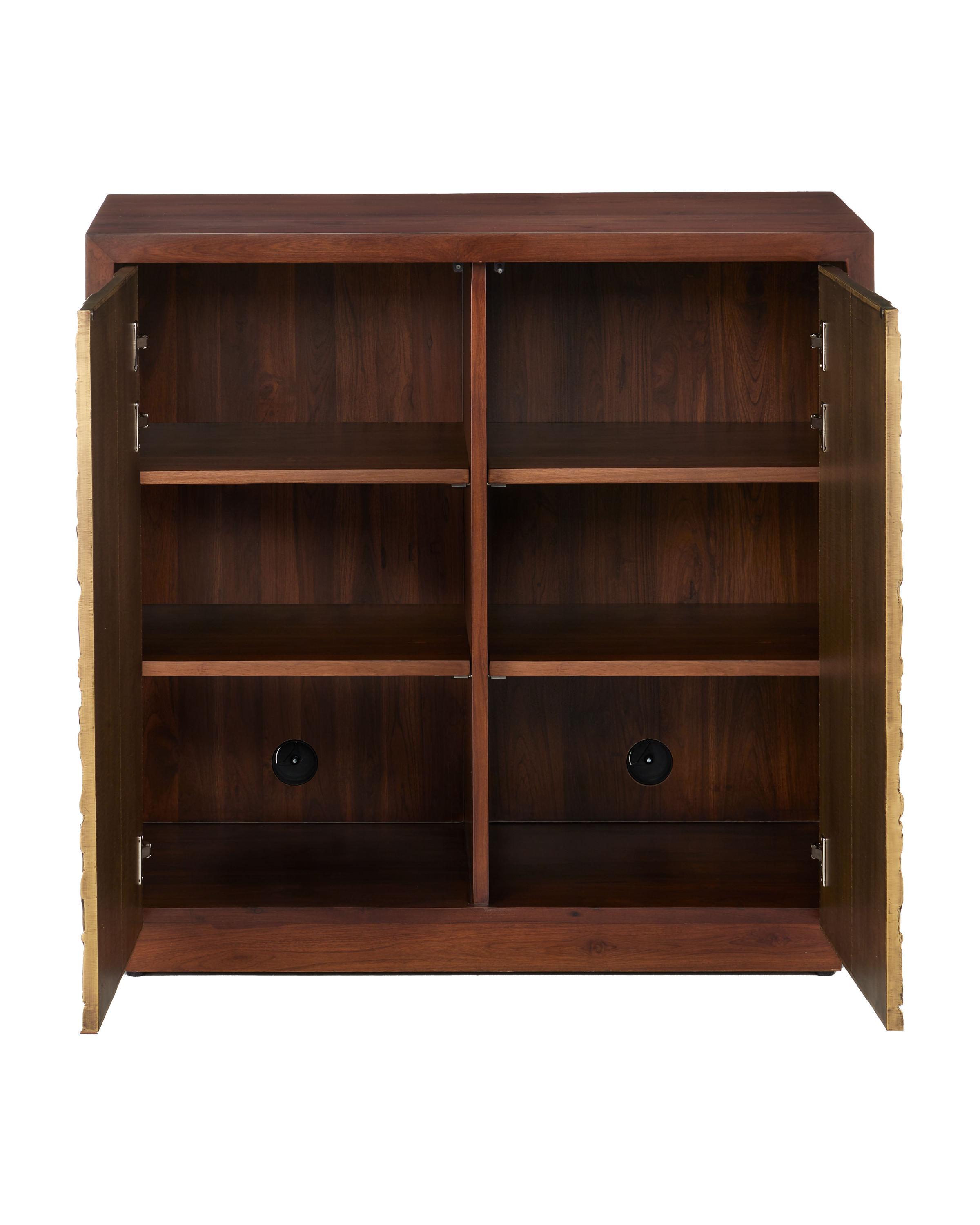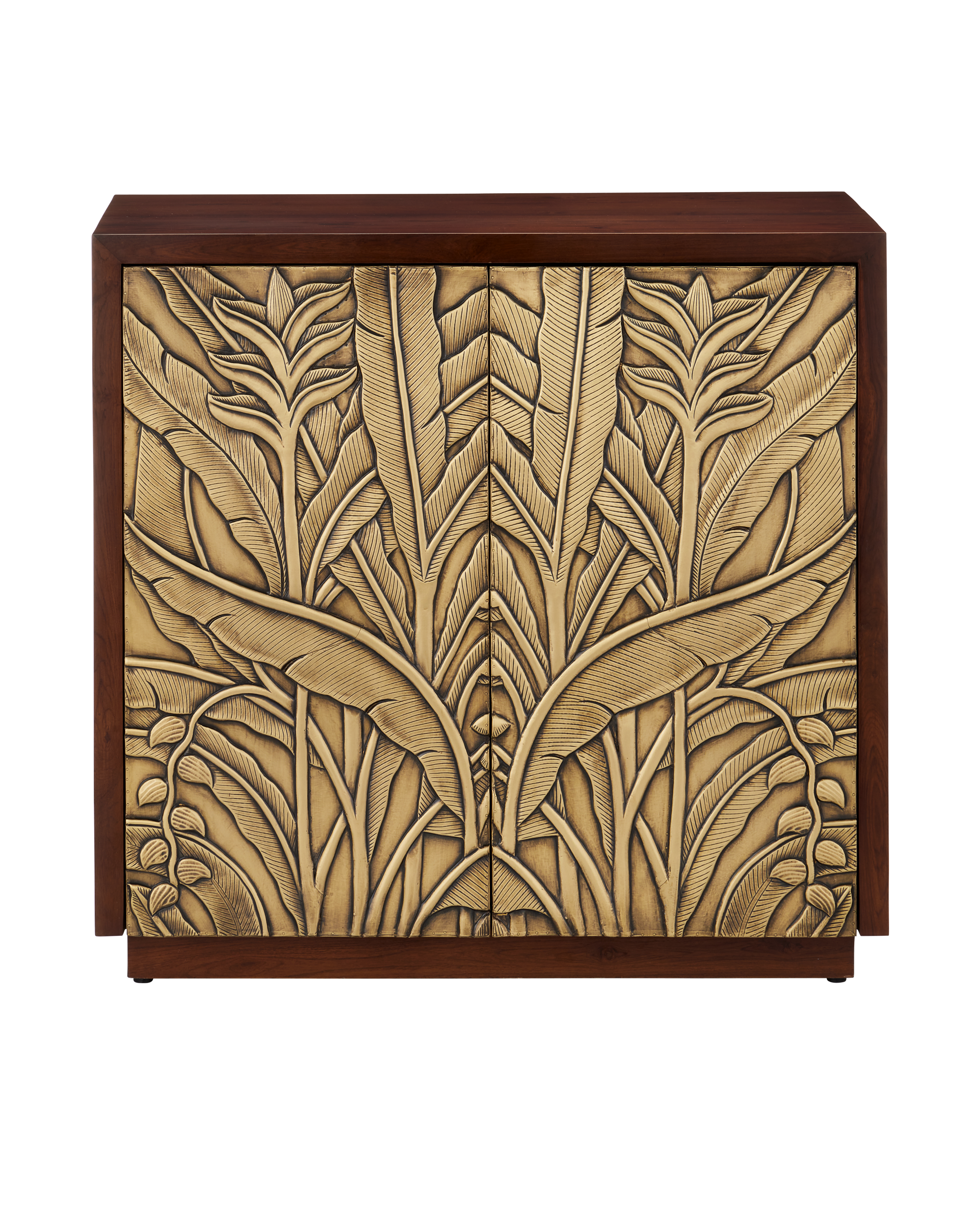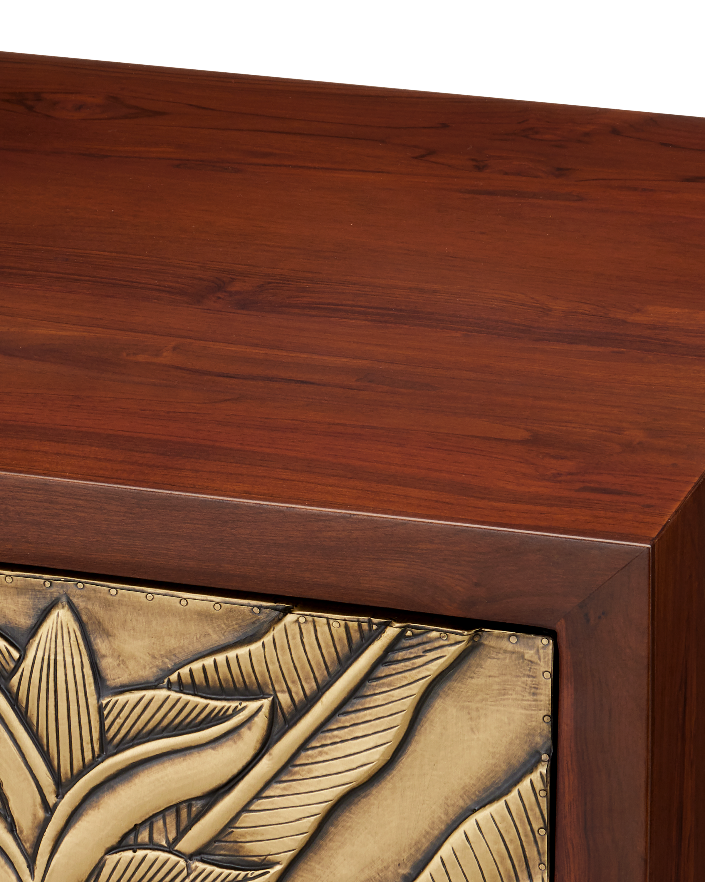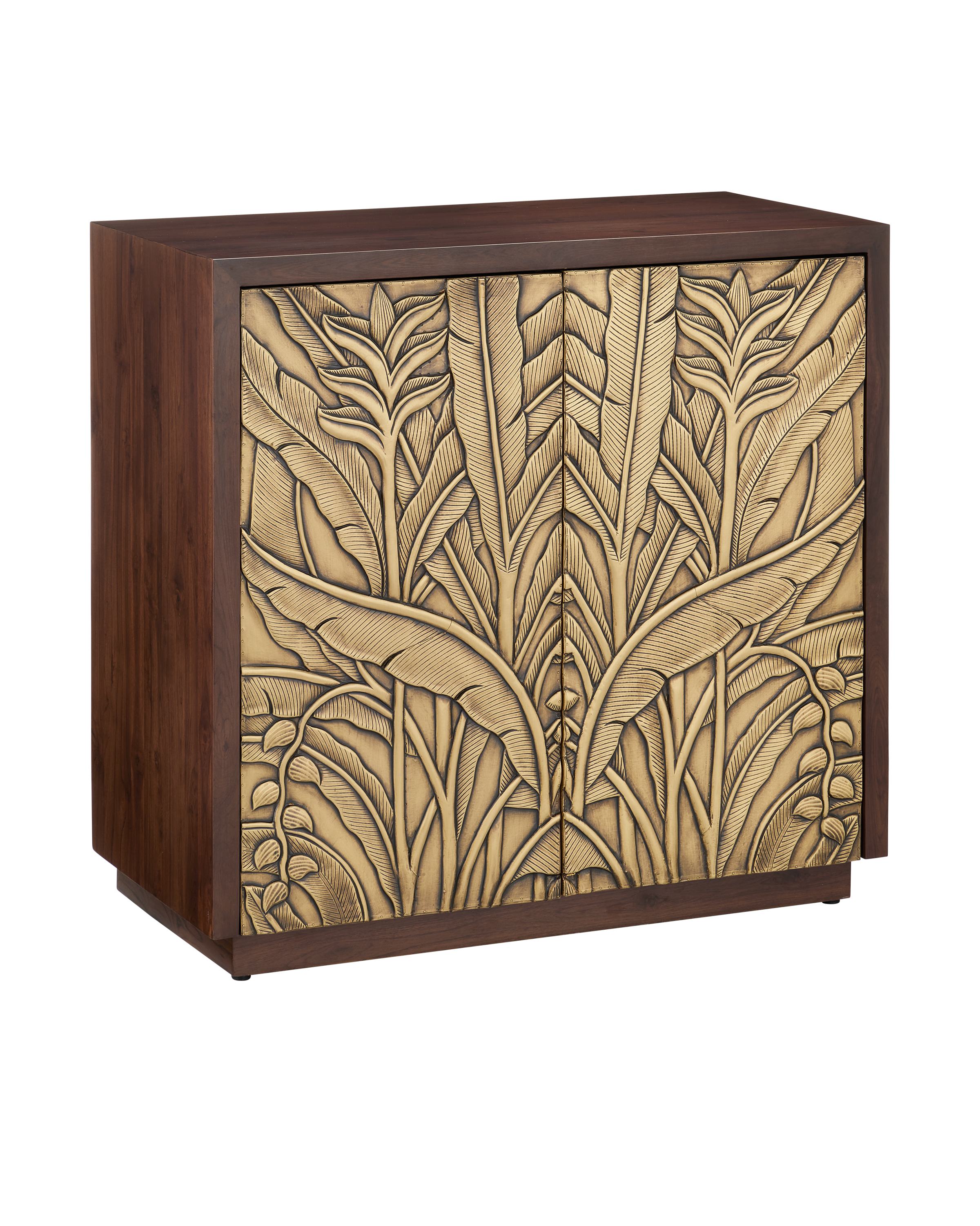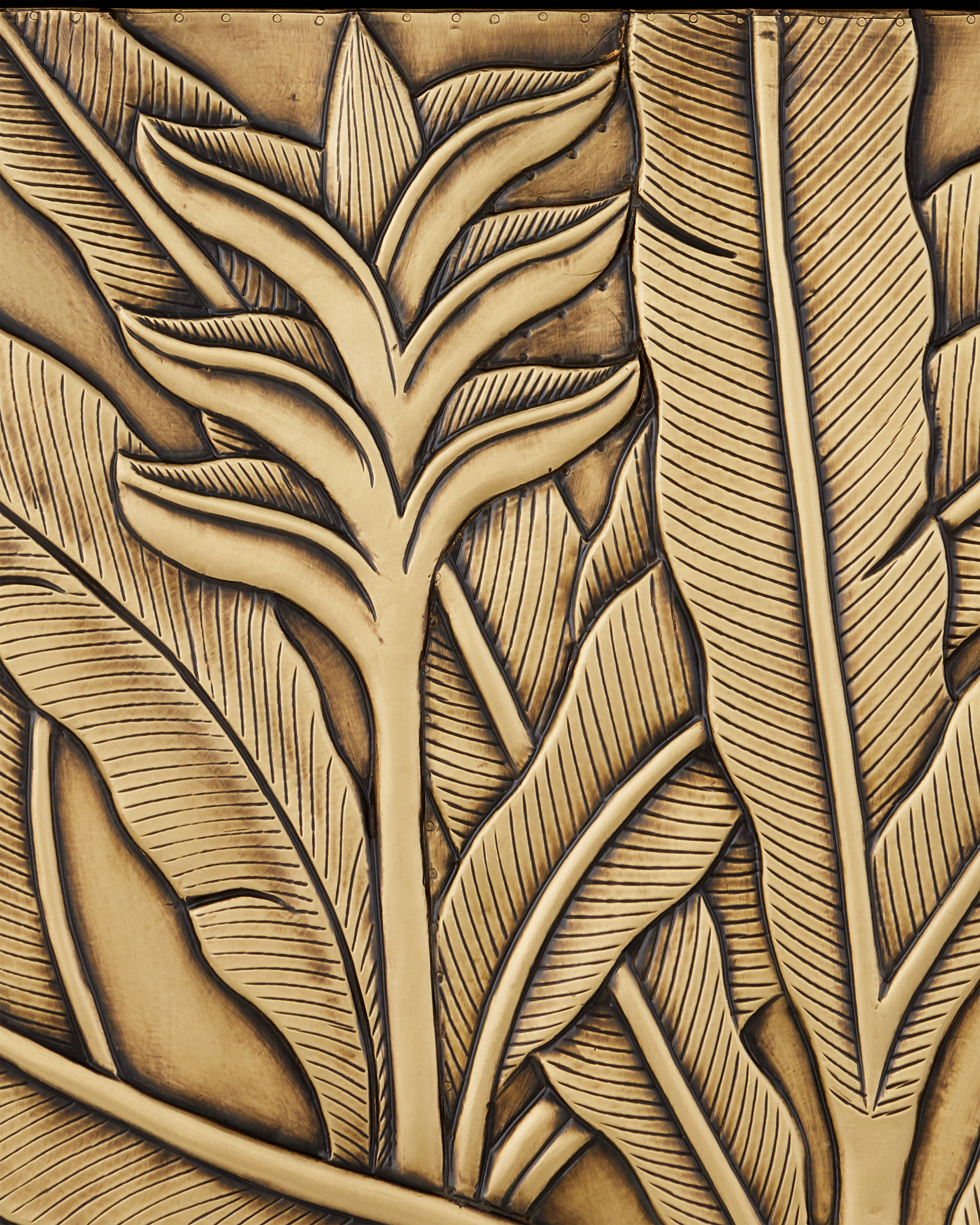 The Jardin Cabinet was created in the tradition of repoussage — a painstaking and laborious process that involves creating low-relief panels with raised motifs onto which thin brass sheets are hammered to reveal the visual richness underneath. In this case, the doors and frame are made of reclaimed teak, finished in walm walnut. The metalwork is rendered in an antique brass finish. This is a tall cabinet, standing 38.5 inches high.