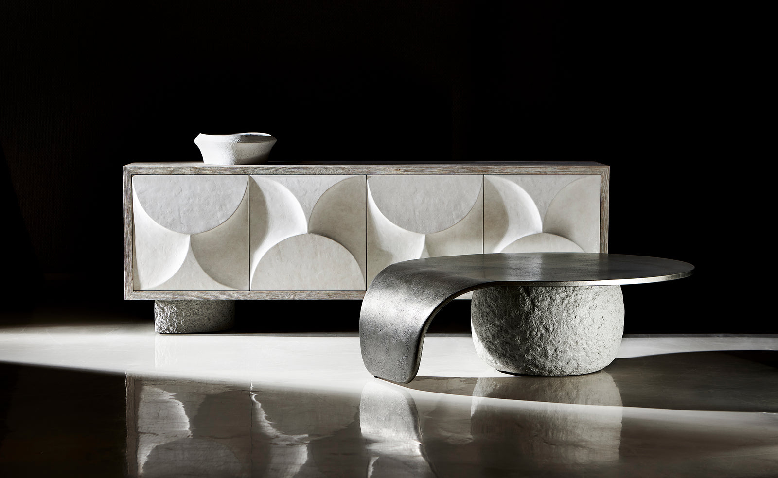 Boldly dramatic design is brought to life in the Lunula entertainment credenza. Cast resin creates a textural surface with dimensional forms that captivate and engage. A wood frame in a Flaxen finish embraces the exuberant look, while cast and chiseled concrete bases support the elemental vision. Four soft-close doors open to showcase ample storage.