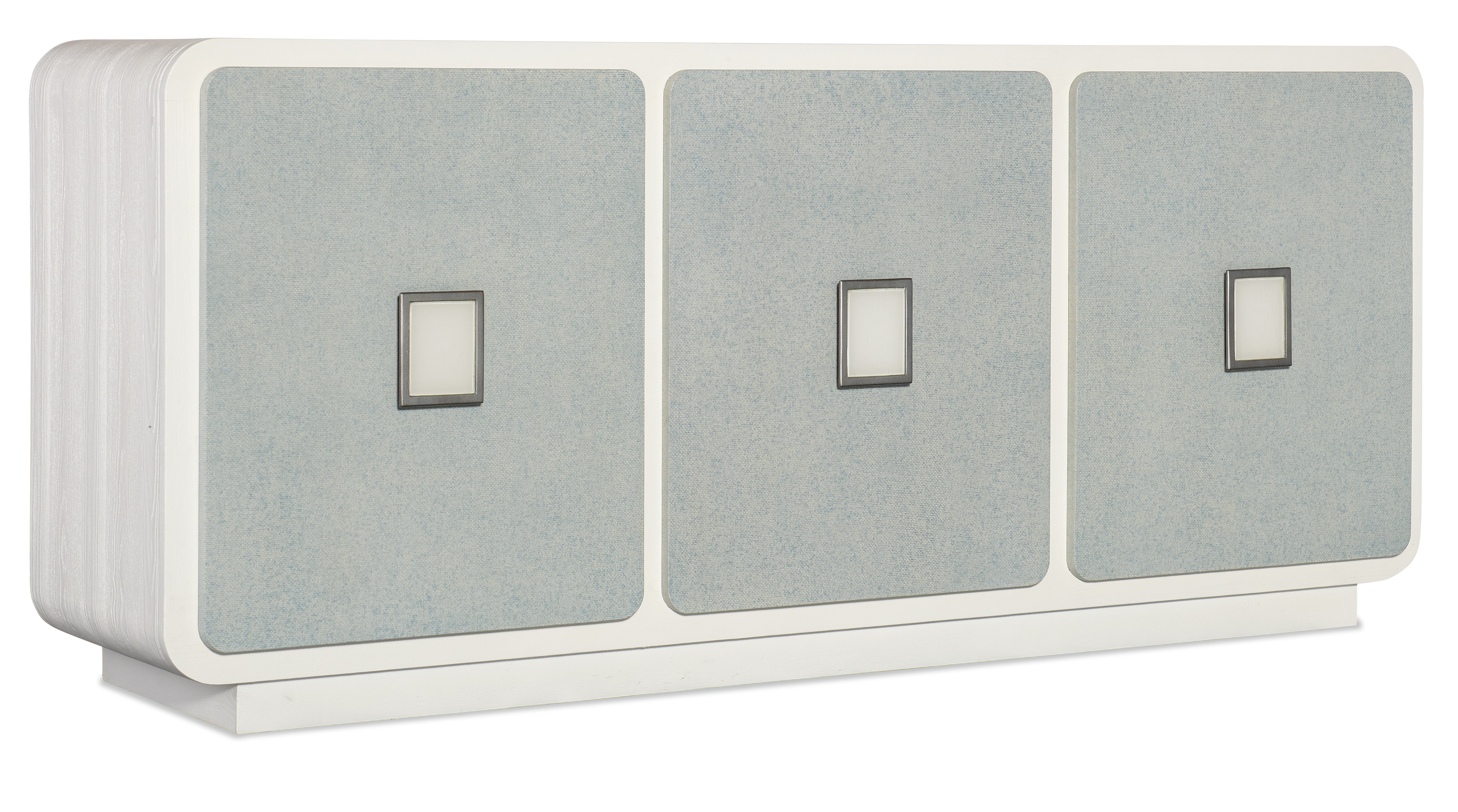 Serene and stylish with a spa-like color scheme, the modern Atlantis Entertainment Credenza has rounded corners on a rectangle shape, raffia-wrapped door fronts and a creamy white plinth base, sides and front. Dramatic square-shaped hardware is silver-colored metal with white painted glass. The three doors have soft-close hinges and magnetic door catches with one adjustable shelf behind each door, a ventilated back panel and a three-plug electrical outlet behind the middle door. The pale blue tone of the raffia-wrapped doors is inspired by Caribbean beaches.