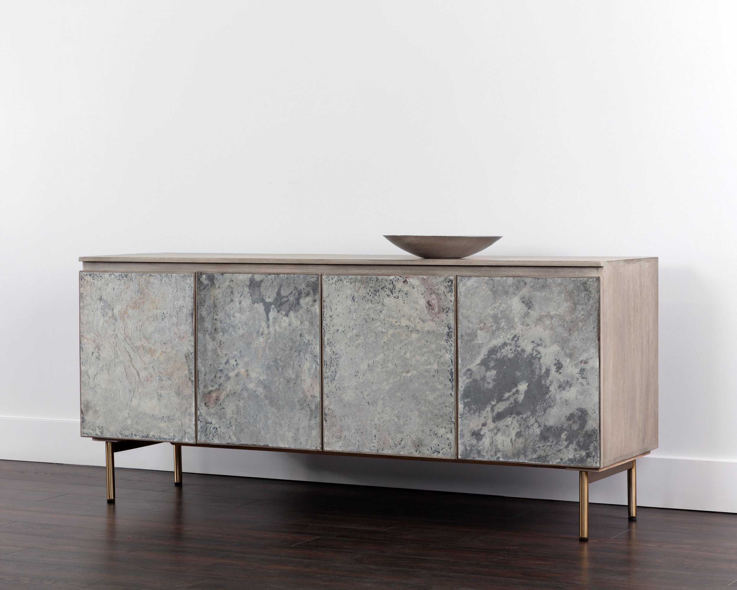 Rich with texture, this unique sideboard illustrates the beauty of mixed materials coming together in harmony. Features a grey solid mango wood frame with slate veneer on the door fronts. Completed with stainless steel legs in a brass finish. Made in India: with refined craftsmanship, this design was brought to life by skilled local artisans. By nature, these materials develop unique imperfections such as fissures, markings and colour variations for a truly one-of-a-kind piece. As wood is an organic, porous material, these pieces will contain natural variation of texture and may also exhibit fine indentations and cracks. Wood pieces will also display a disparity of colour and grain, and visible knots and burls that add to the character of each piece. Due to the organic material on the cabinet doors, variations in colour may occur on actual product.
