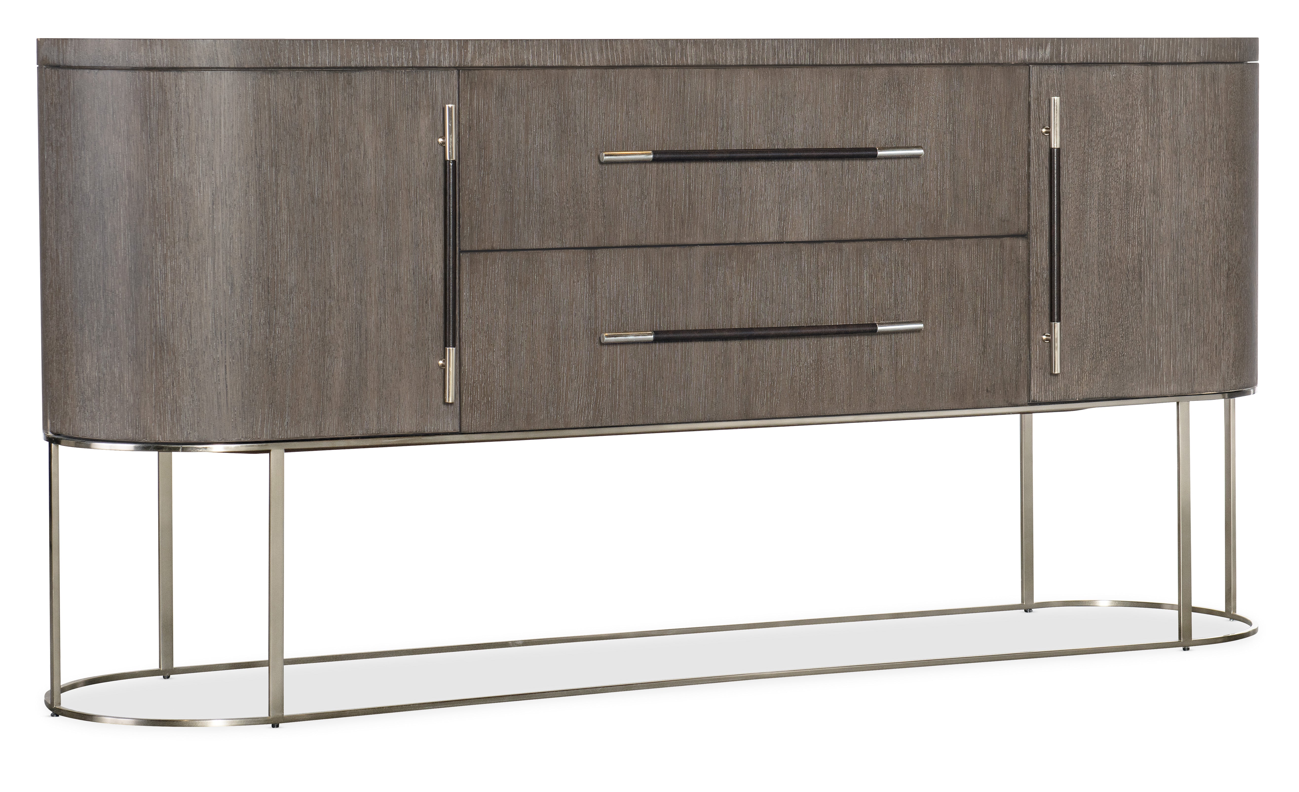 Softly sophisticated with a clean modern profile and luxe mixture of materials, the Modern Mood Server is a stunning statement piece. The case has rounded corners, is finished on all sides and has an oval metal stretcher that goes all the way around. Crafted of Quartered Oak Veneers, the server has tactile wire-brush detailing in a serene Mink finish. The metal on the hardware and base is in a brushed warm pewter finish, and the bar pulls are wrapped in leather. The two wood doors have soft-close hinges and magnetic catches. There ’s one adjustable wood shelf behind each door, and the two drawers are self-closing and feature a drop-in silver tray liner in the top drawer.