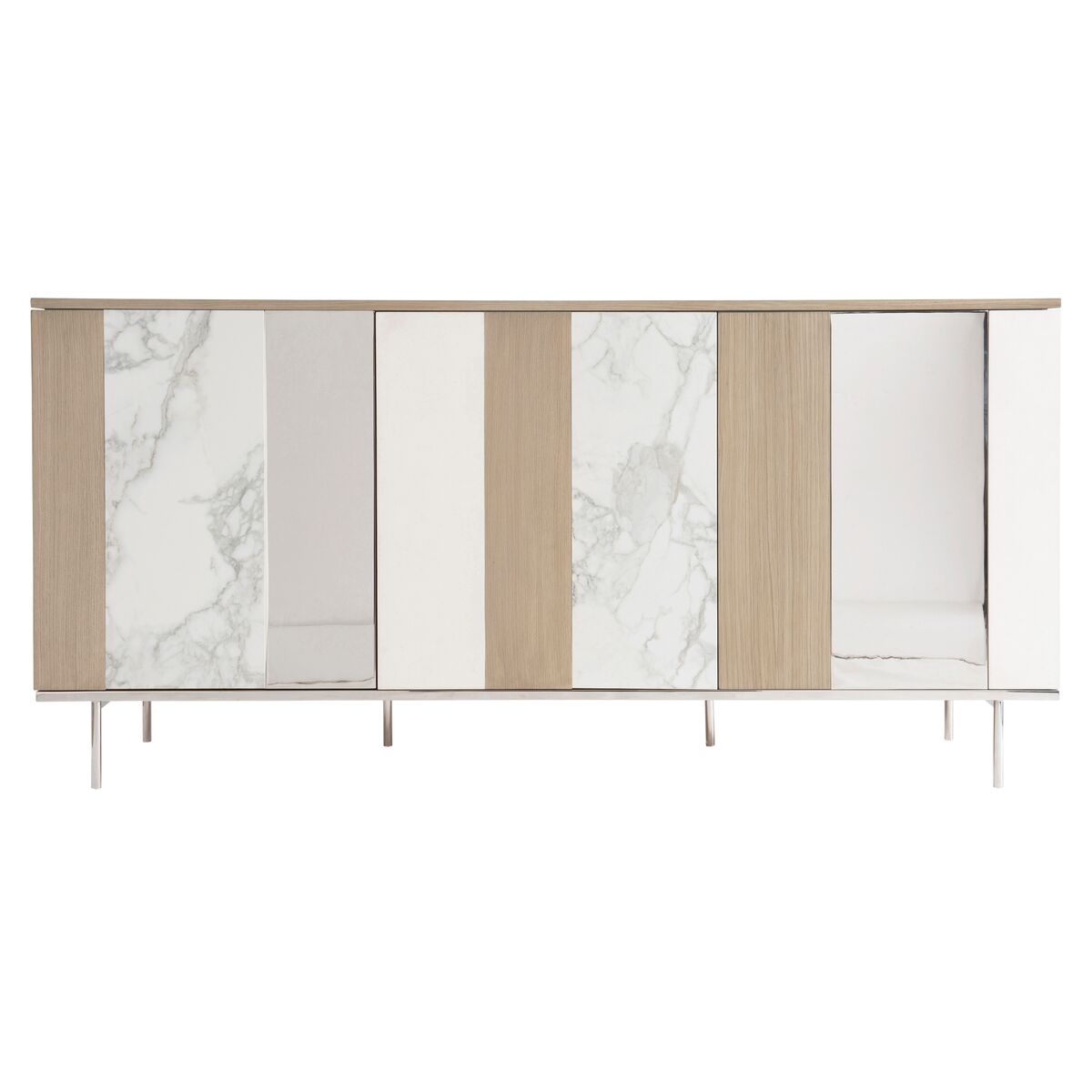 Geometric styling is the hallmark of the Modulum collection and this buffet showcases the best of that design inspiration. Vertical panels of wood, stainless steel, and faux marble create a striking pattern over three push-to-open doors. Inside are both fixed and adjustable shelves, grommets and vents, as well as one soft-close drawer. The buffet rests on a metal base and six legs.