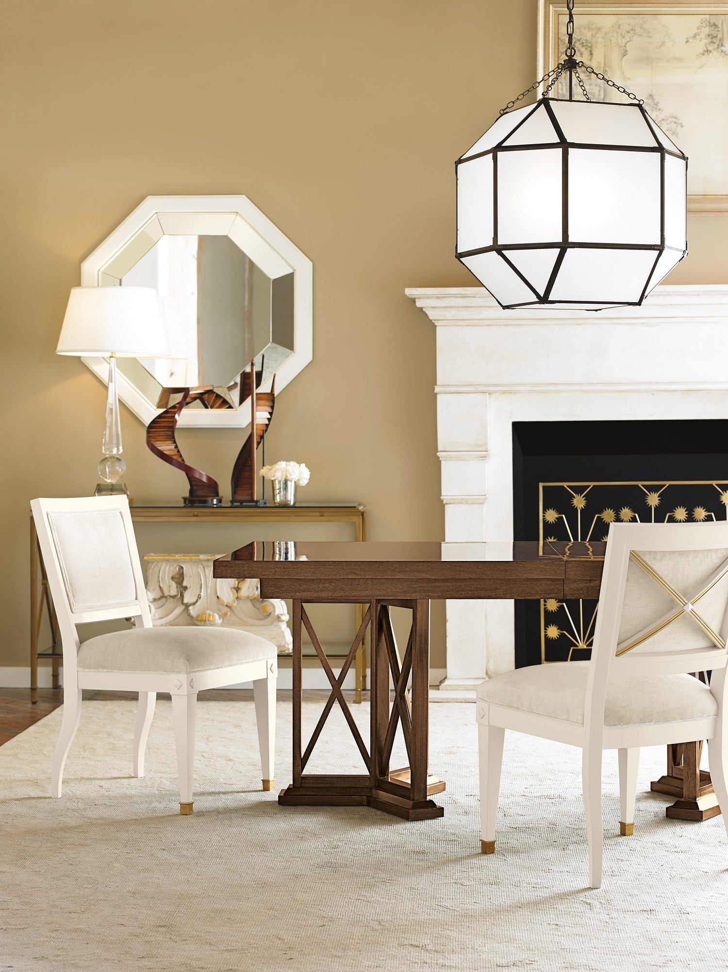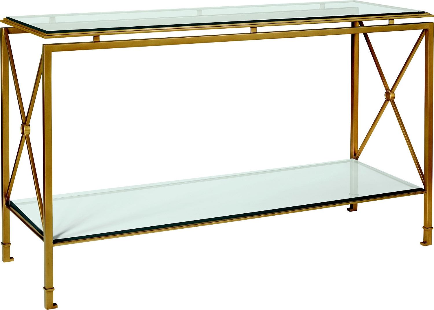Another new member of the Montpelier table series, the Montpelier Console brings a new dimension to this French Moderne inspired collection of tables. Featuring a lower shelf and repeating the X-motif seen on the Montpelier Side Table with a French Brass finished metal console base. Montpelier is the only finish for the metal base with clear glass top and shelf.