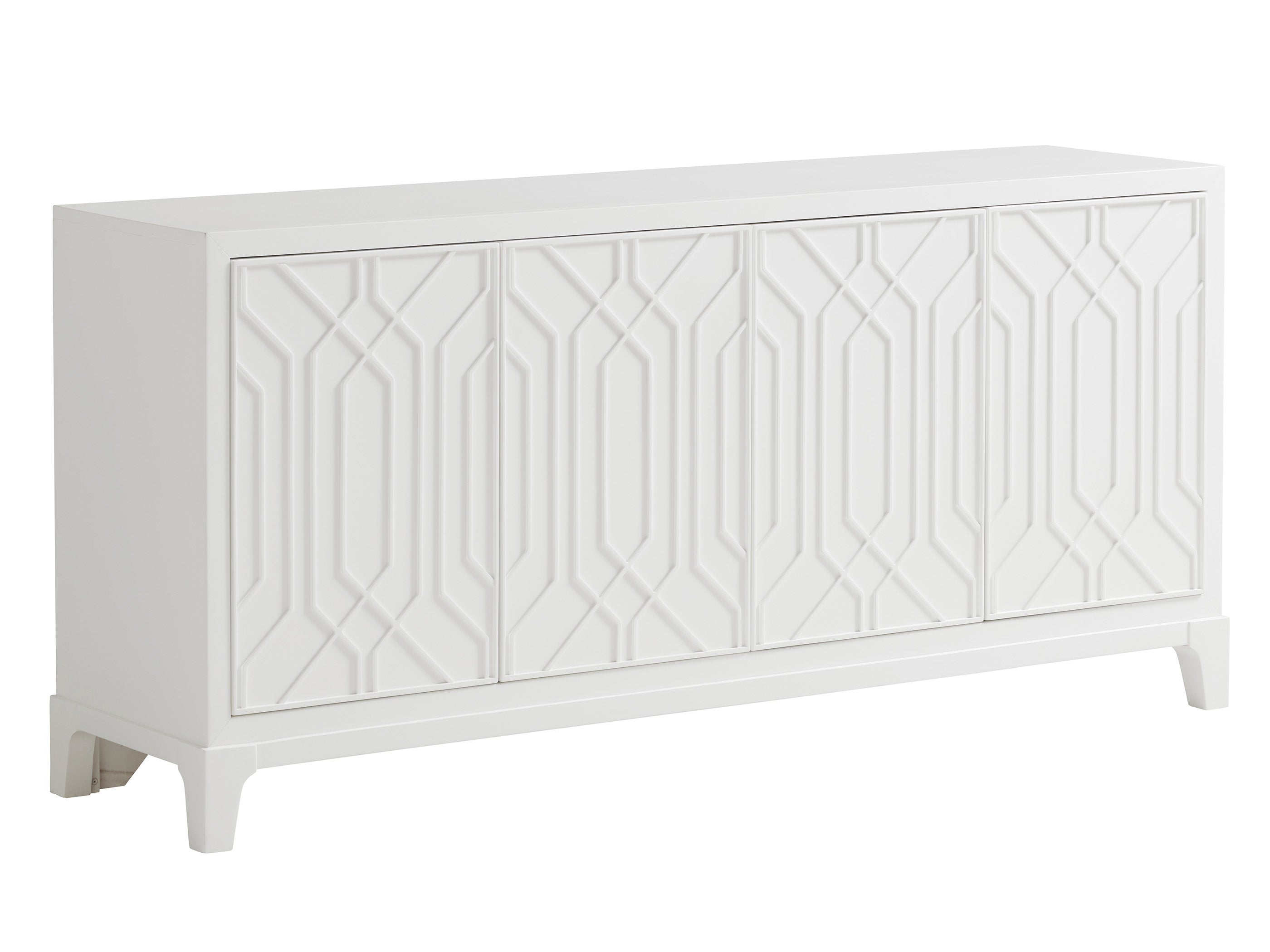 Dimensions: Width: 72.75Depth: 18.5 Height: 34 Weight: 269 - 4 doors with contemporary fretwork design, 2 felt-lined drawers (1 divided for silverware), 2 adjustable shelves, and grommet for cord management behind each pair of doors.