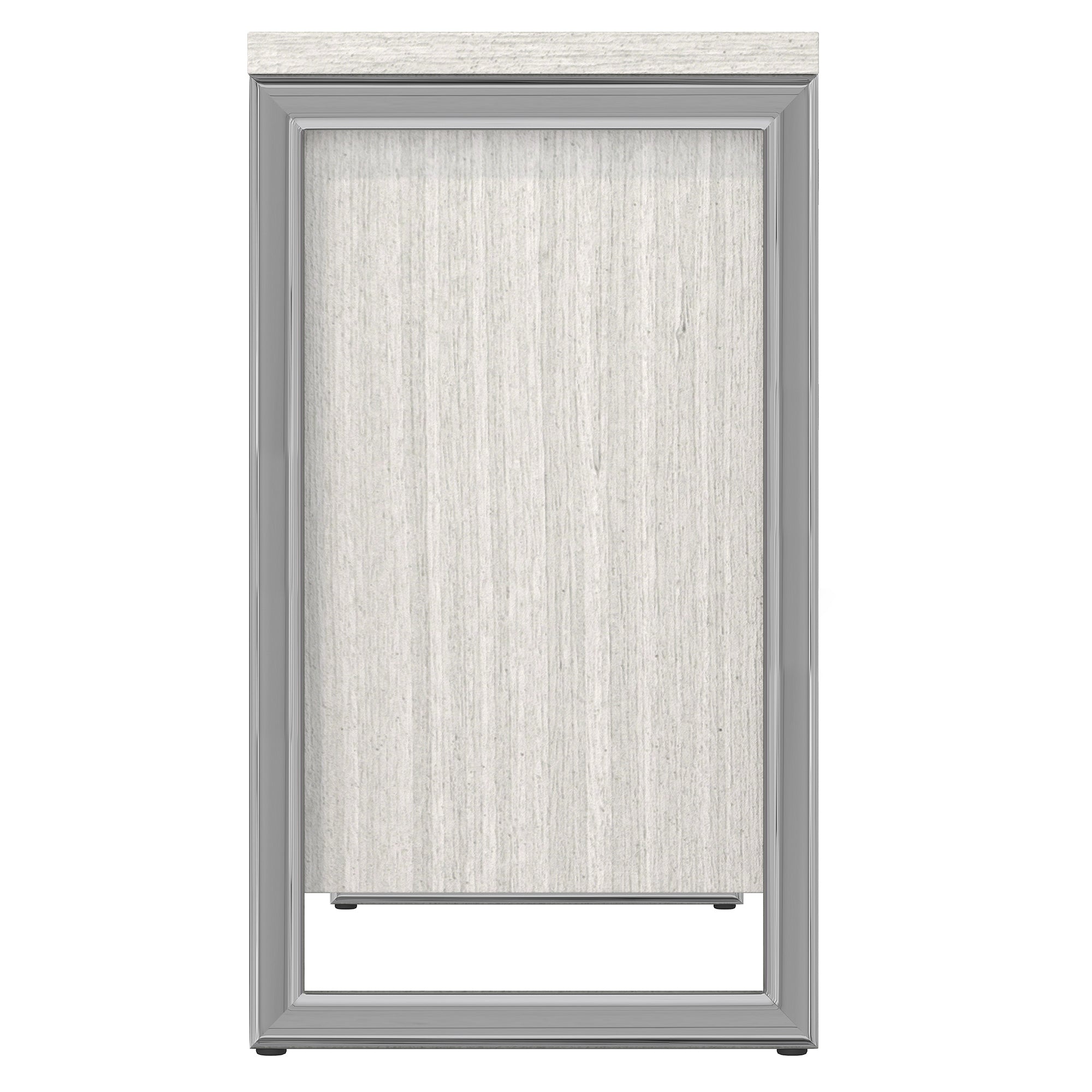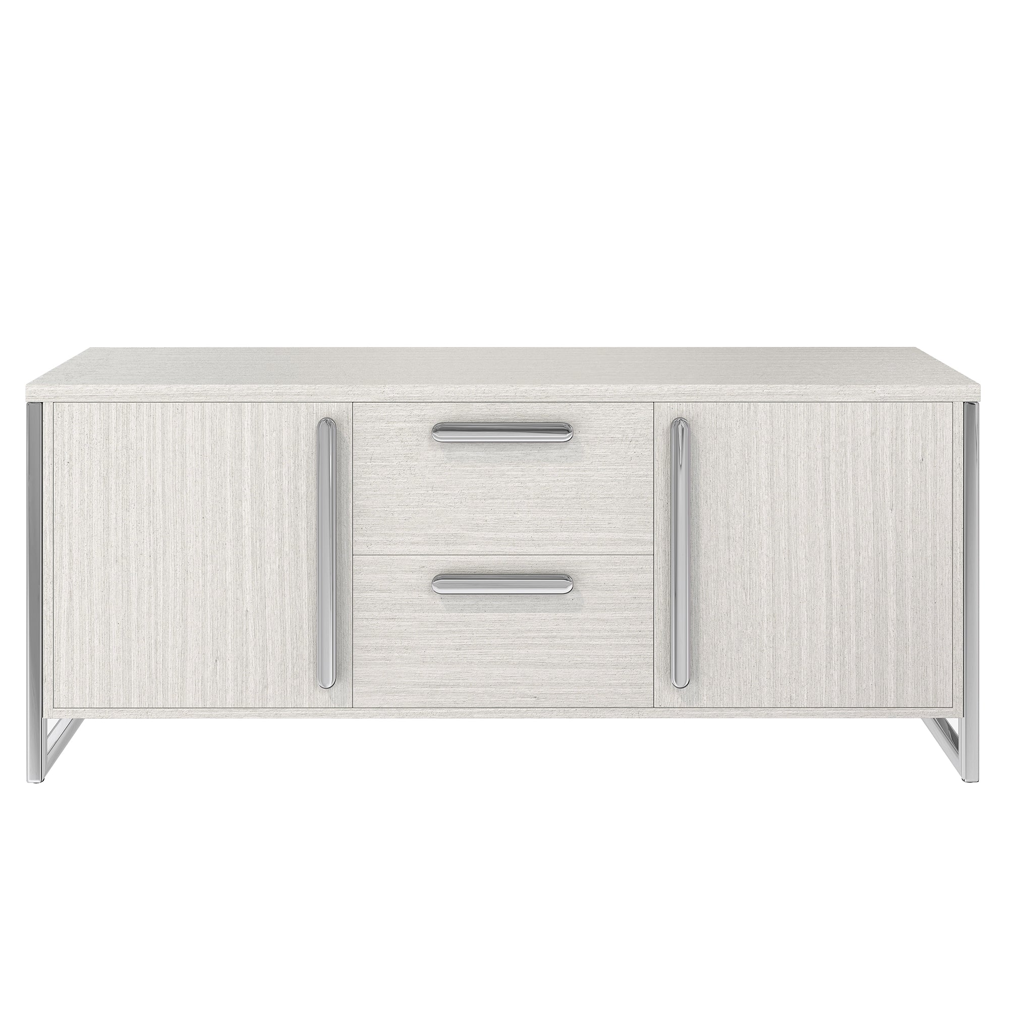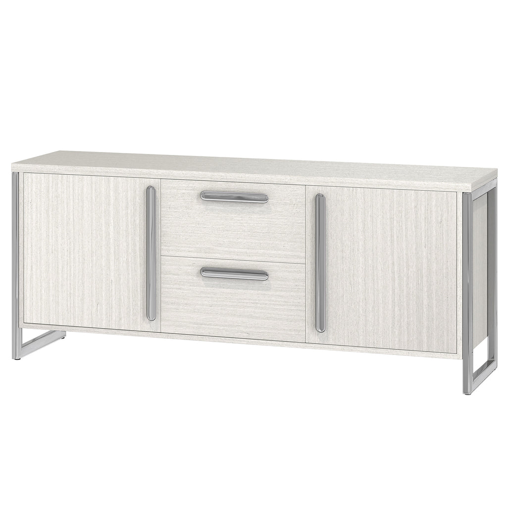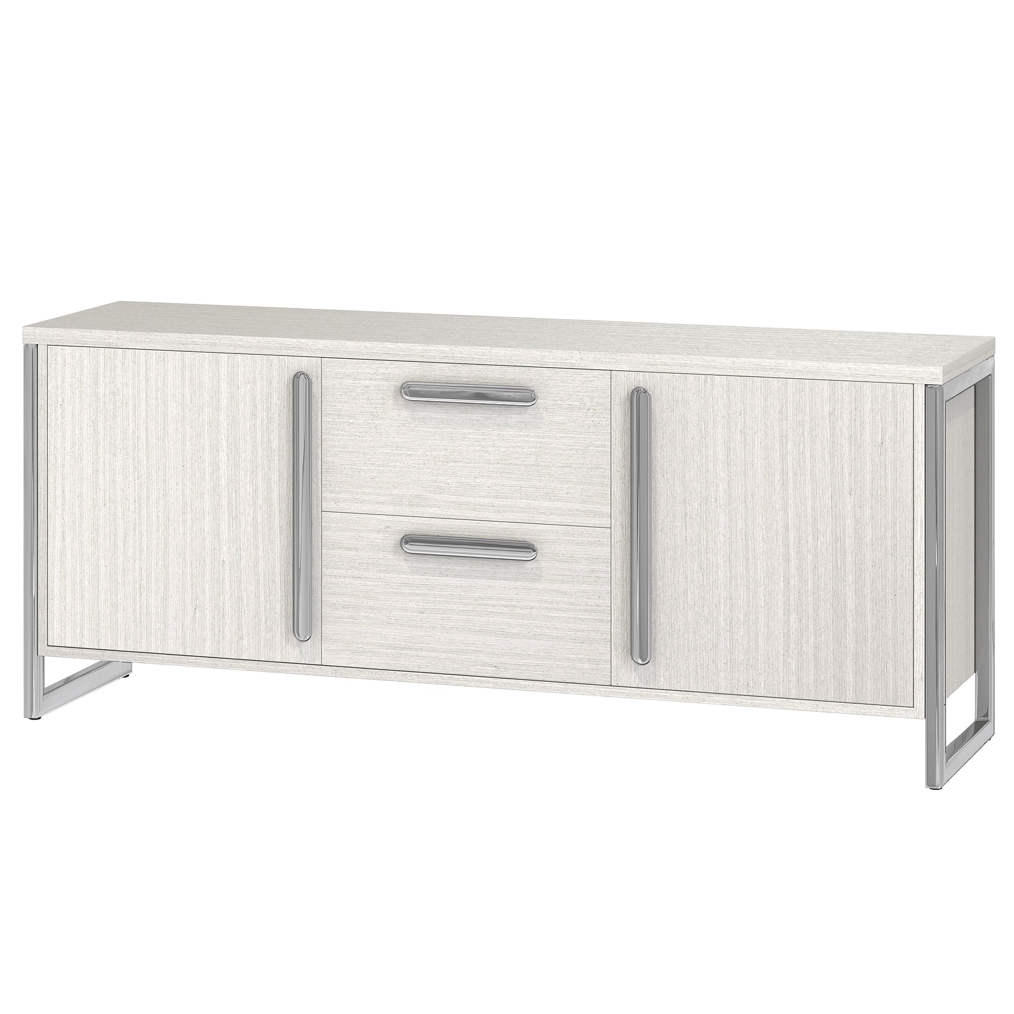 Mist finished case with two doors and two center drawers. Two adjustable shelves behind each door. Black wrapped pad insert in each of the two drawers. Nickel plated end frames. Adjustable glides. Anti-tip kit.
