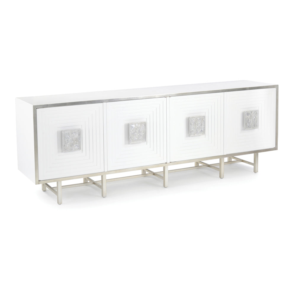 Set on a steel base in pewter silver, the four doors of this impressive sideboard feature a pattern of squares reducing in size as they increase in Depth. A cast metal handle with a textured center pattern finished in whitewashed silver completes each door. The case and doors are finished in beluga with a pewter silver detail around the front.