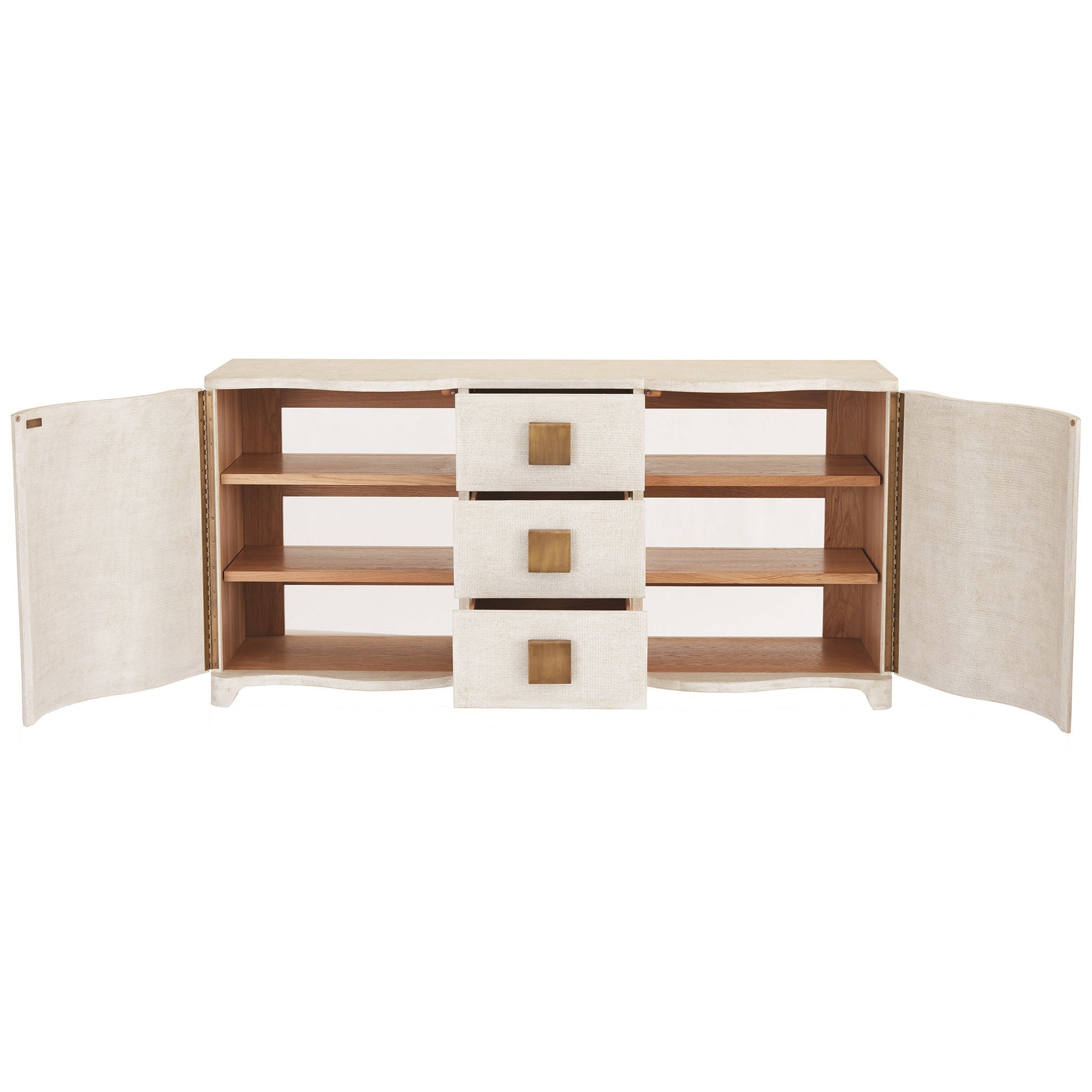 Wrapped by hand in fine Belgian linen then given a multi-layered paint glaze, this collection features an oak-lined interior and custom hardware with antique brass finish. A technique that fell out of favor for many years, fabric-wrapping furniture is an exacting art we have revived with the help of one of the industry's leading manufacturers of fine accent furniture. Slat back design allows for easy access to component wiring.|Bringing the past into the present is something Studio A Home loves to do! And we've done it again with our Toile Linen Credenza. With a technique revived and reimagined with the world's finest craftspeople, these beautiful pieces are wrapped in fine Belgian linen then given a multi-layered hand-finished glaze. The sumptuously textured credenza features an oak-lined interior and custom hardware with an antique brass finish. A slat back makes for handy access for all your audio-visual component wiring.